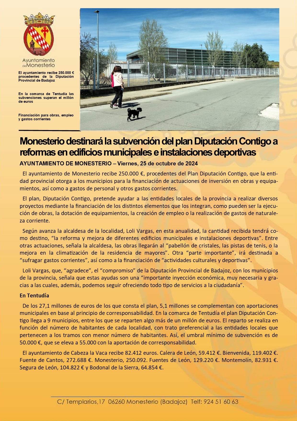 Monesterio destinará la subvención del plan Diputación Contigo a reformas en edificios municipales e instalaciones deportivas