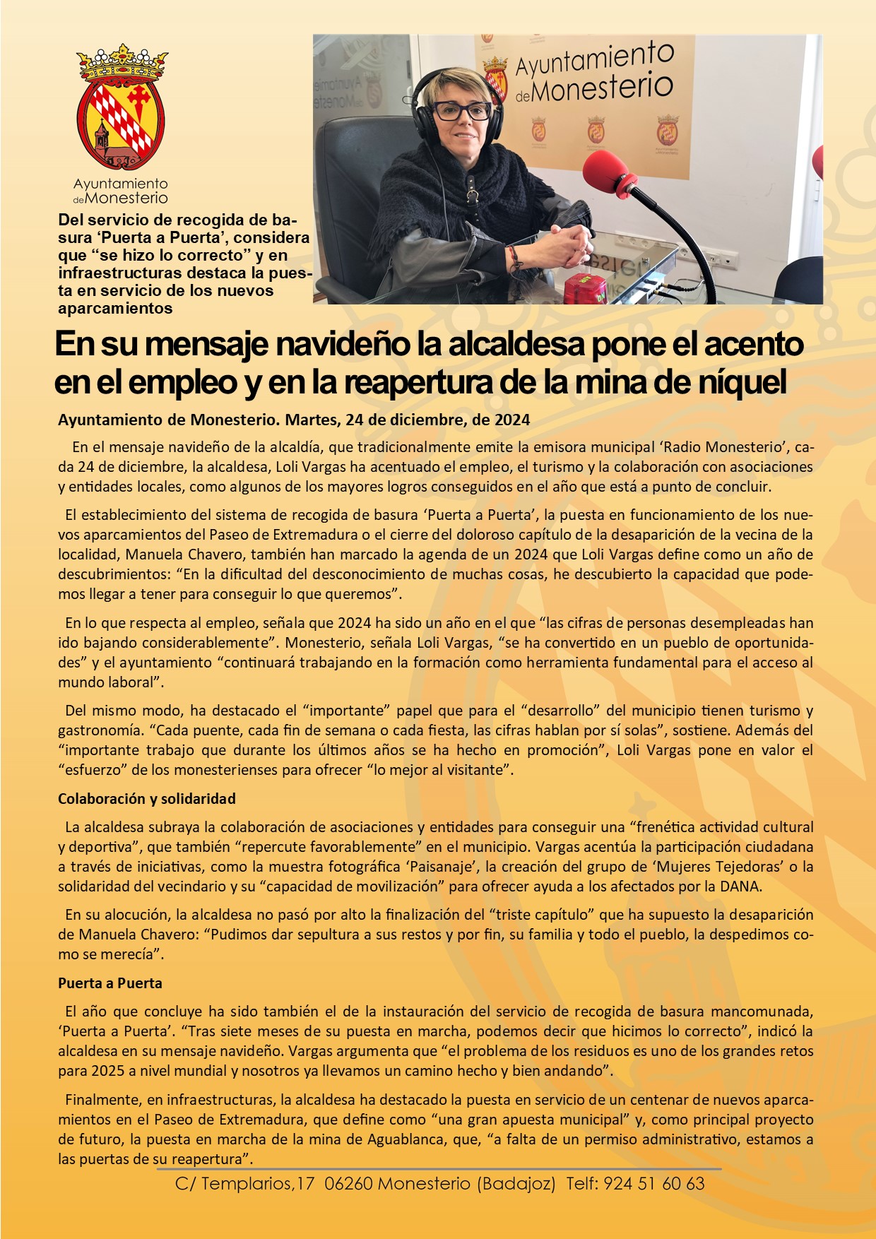 En su mensaje navideño la alcaldesa pone el acento en el empleo y en la reapertura de la mina de níquel