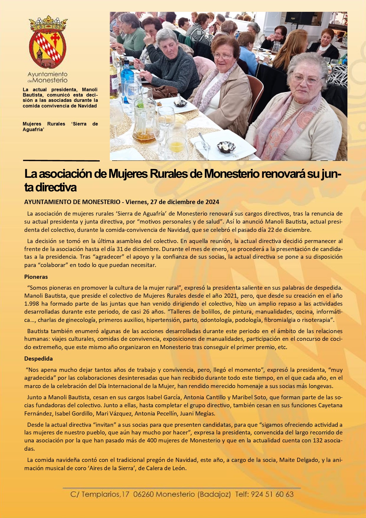 La asociación de Mujeres Rurales de Monesterio renovará su junta directiva
