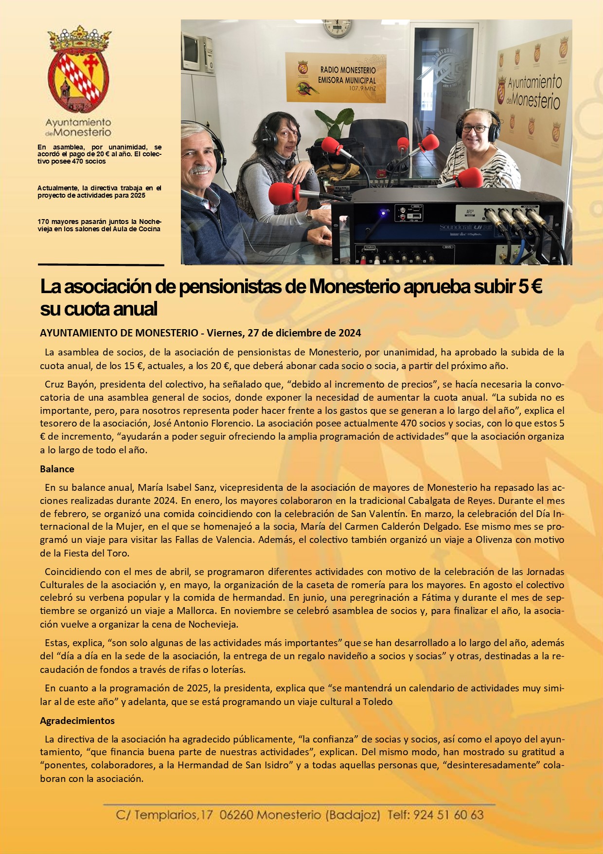 La asociación de pensionistas de Monesterio aprueba subir 5 € su cuota anual