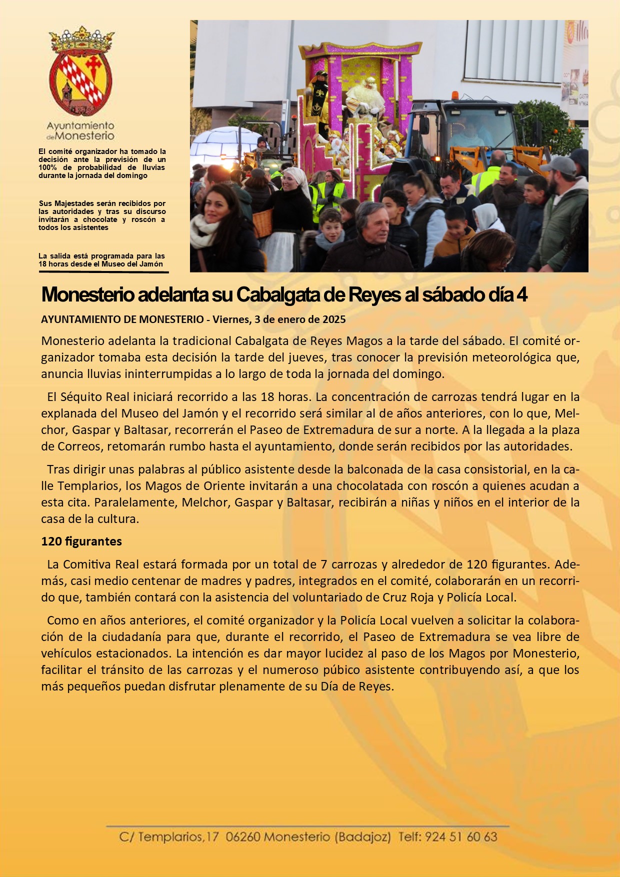 Monesterio adelanta su Cabalgata de Reyes al sábado día 4