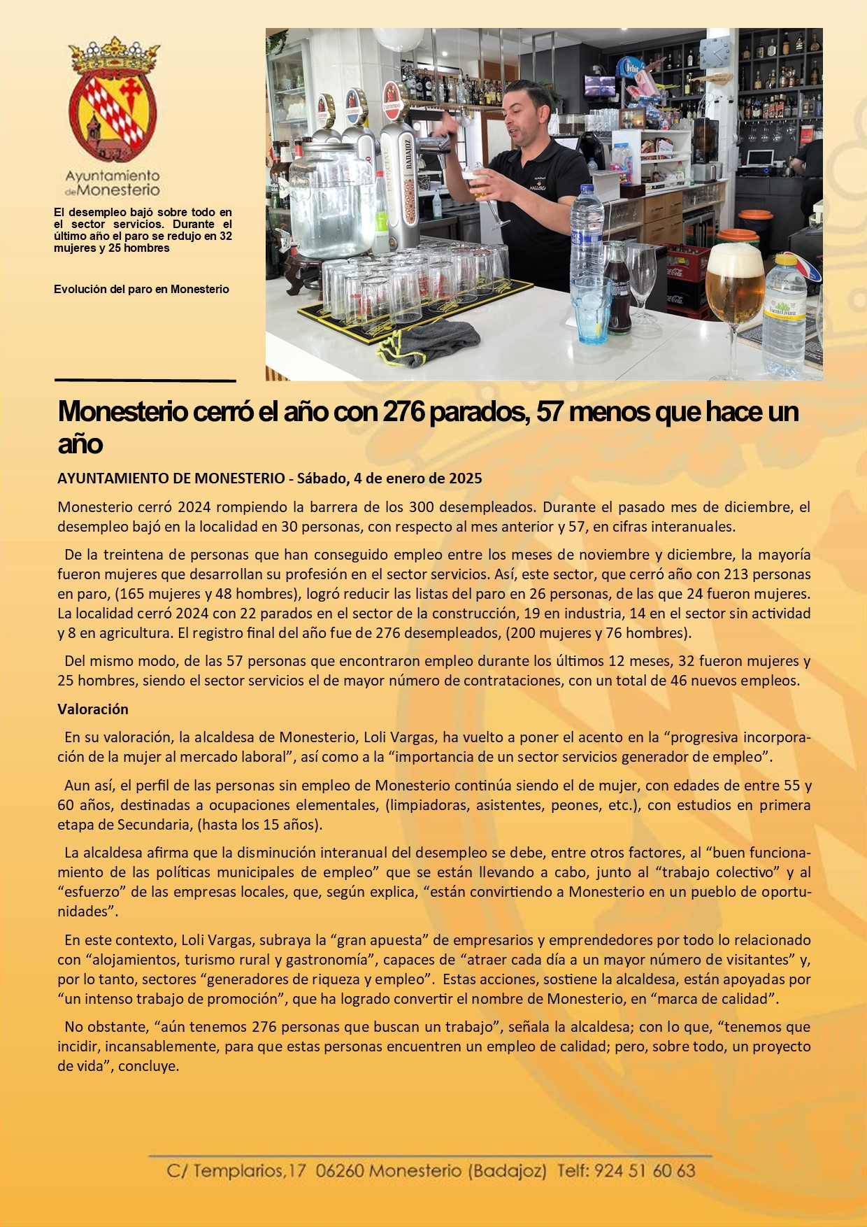 Monesterio cerró el año con 276 parados, 57 menos que hace un año