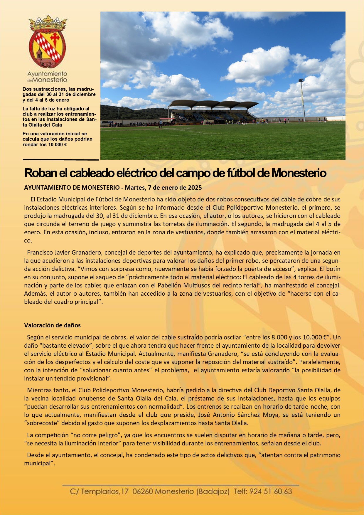 Roban el cableado eléctrico del campo de fútbol de Monesterio
