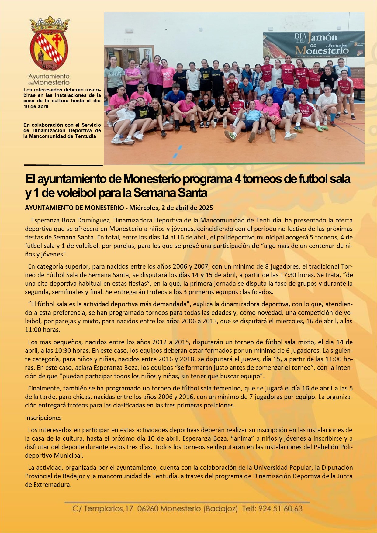 El ayuntamiento de Monesterio programa 4 torneos de futbol sala y 1 de voleibol para la Semana Santa