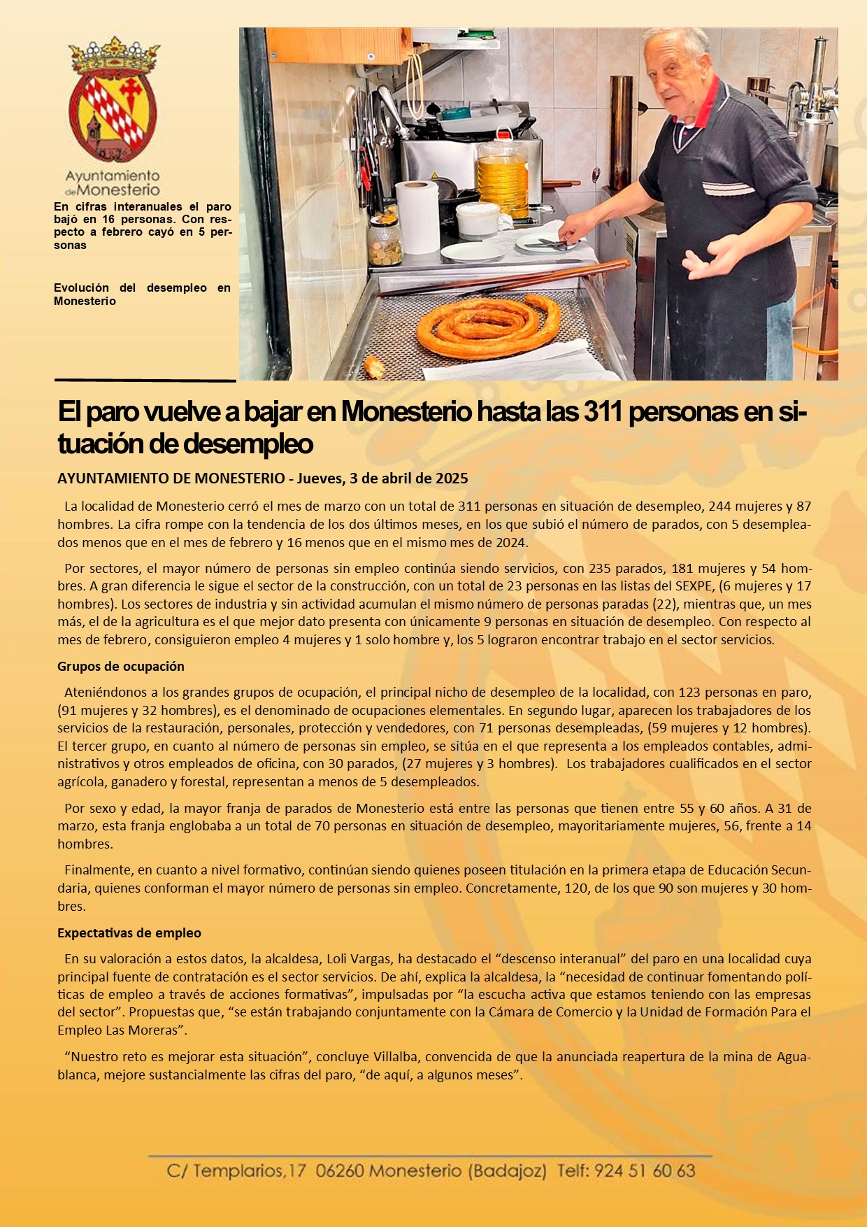 El paro vuelve a bajar en Monesterio hasta las 311 personas en situación de desempleo