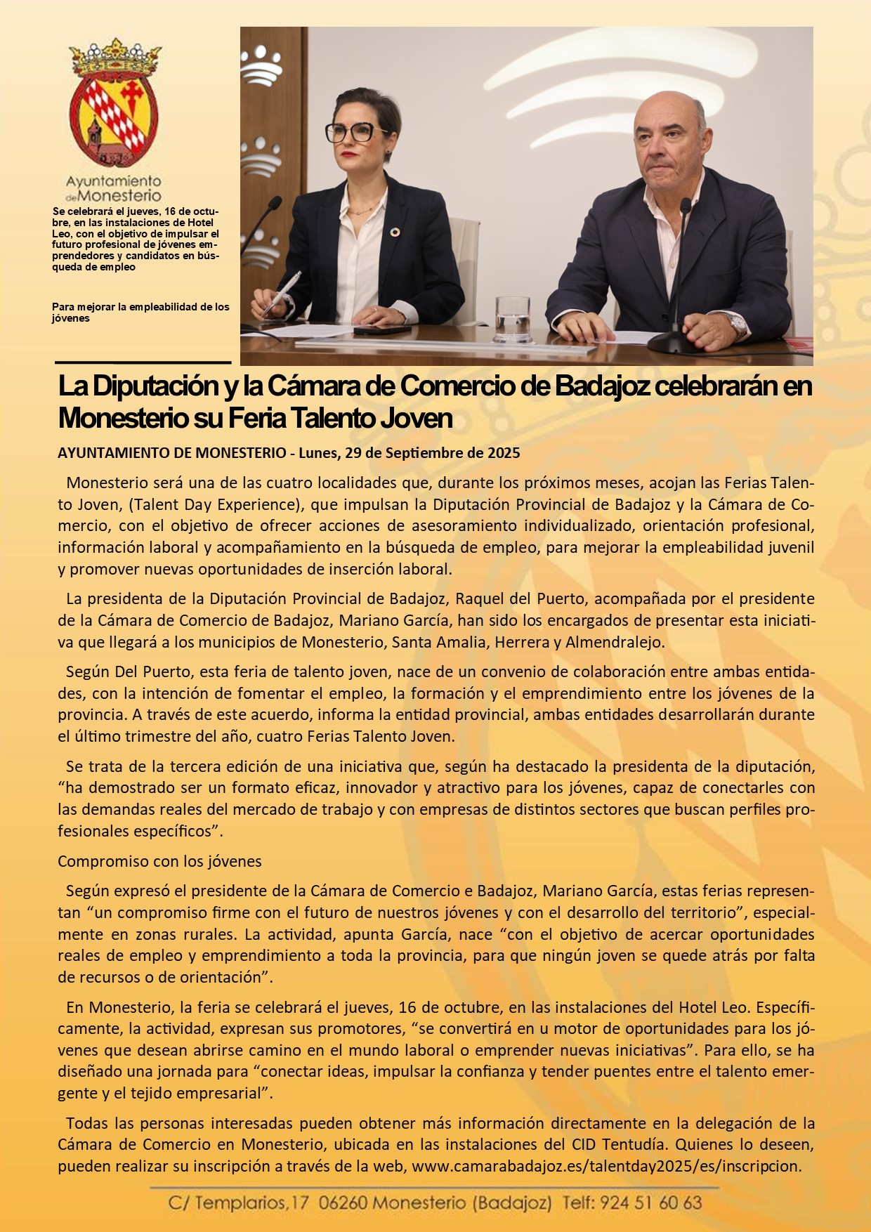 La Diputación y la Cámara de Comercio de Badajoz celebrarán en Monesterio su Feria Talento Joven