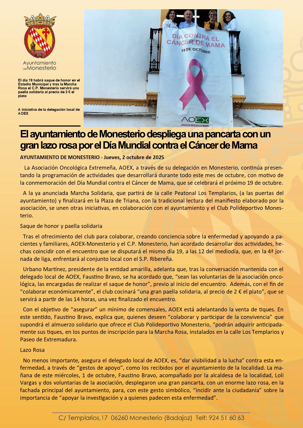 El ayuntamiento de Monesterio despliega una pancarta con un gran lazo rosa por el Día Mundial contra el Cáncer de Mama