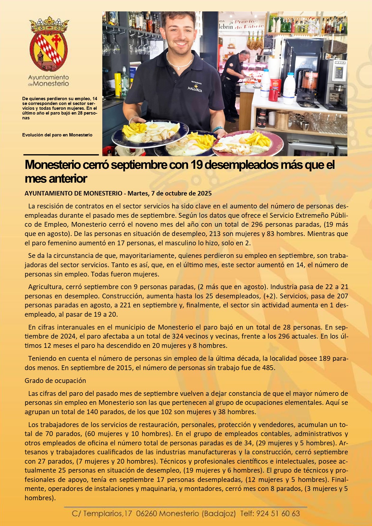 Monesterio cerró septiembre con 19 desempleados más que el mes anterior