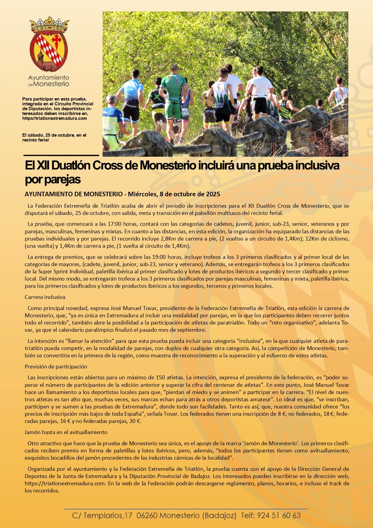 El XII Duatlón Cross de Monesterio incluirá una prueba inclusiva por parejas
