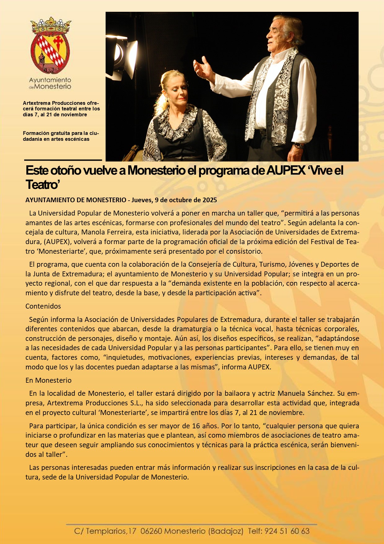 Este otoño vuelve a Monesterio el programa de AUPEX ‘Vive el Teatro’