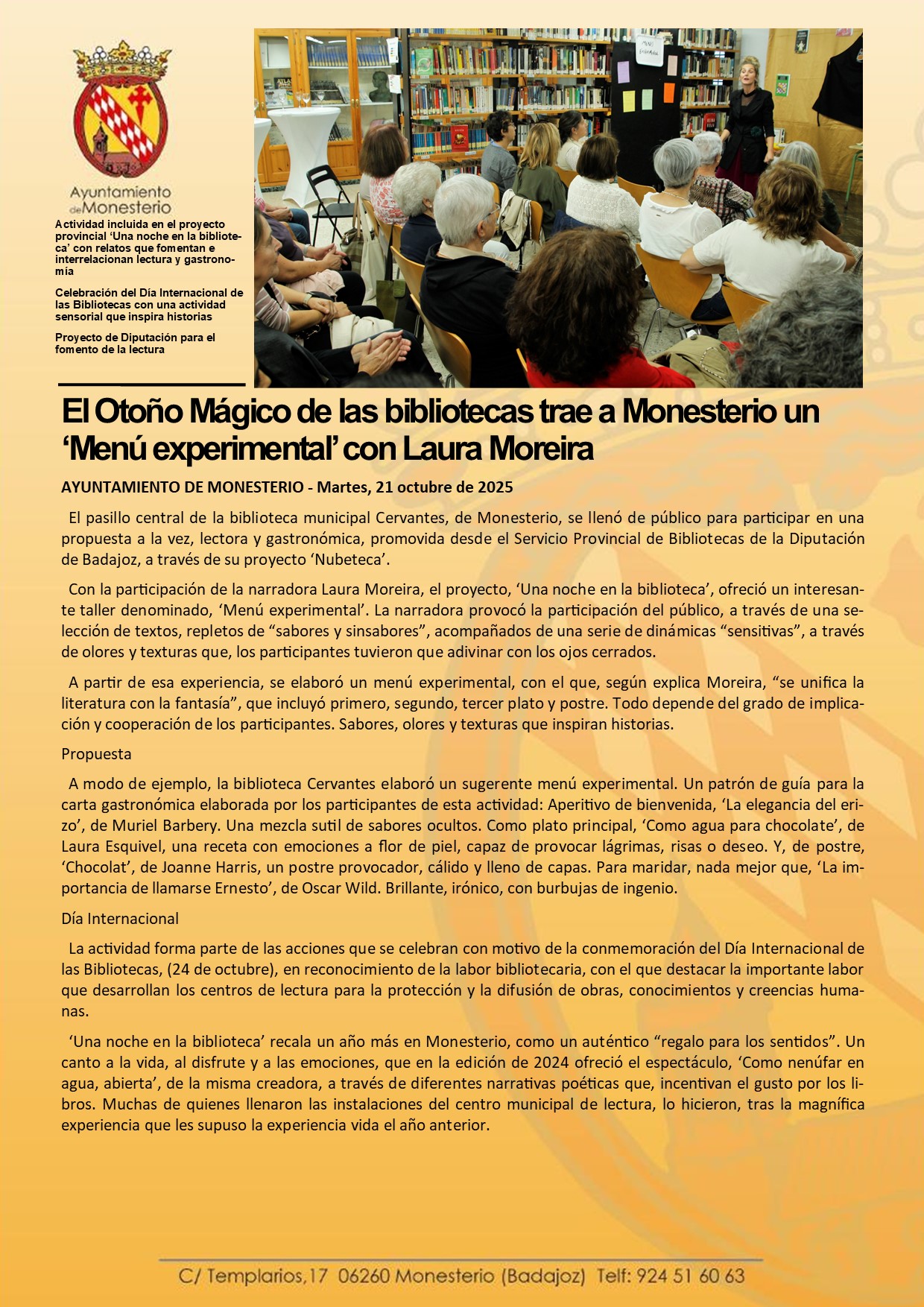 El Otoño Mágico de las bibliotecas trae a Monesterio un ‘Menú experimental’ con Laura Moreira