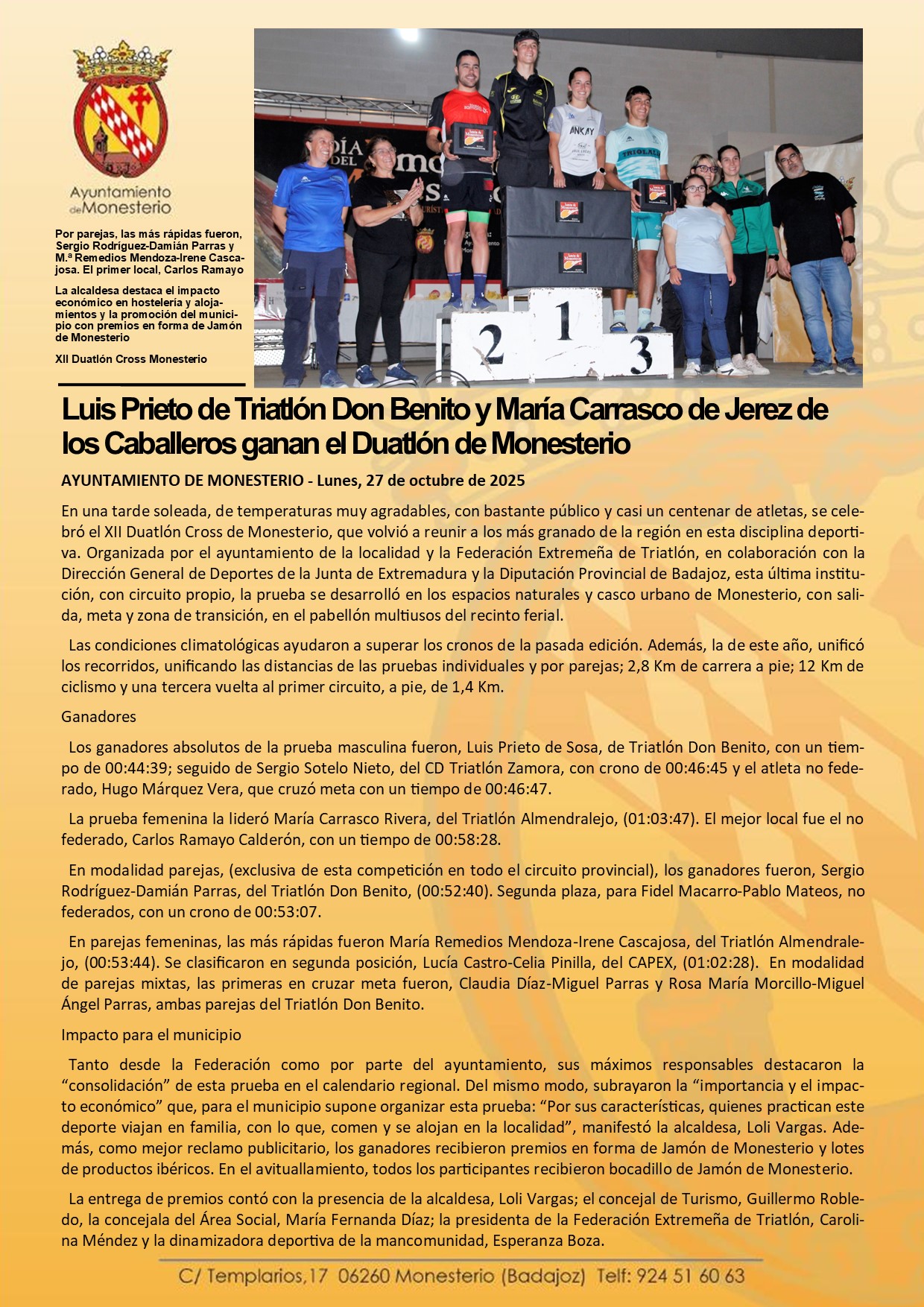 Luis Prieto de Triatlón Don Benito y María Carrasco de Jerez de los Caballeros ganan el Duatlón de Monesterio