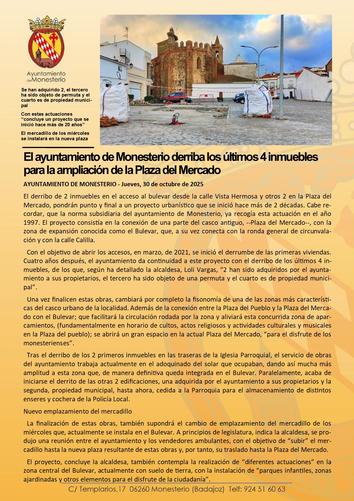 El ayuntamiento de Monesterio derriba los últimos 4 inmuebles para la ampliación de la Plaza del Mercado