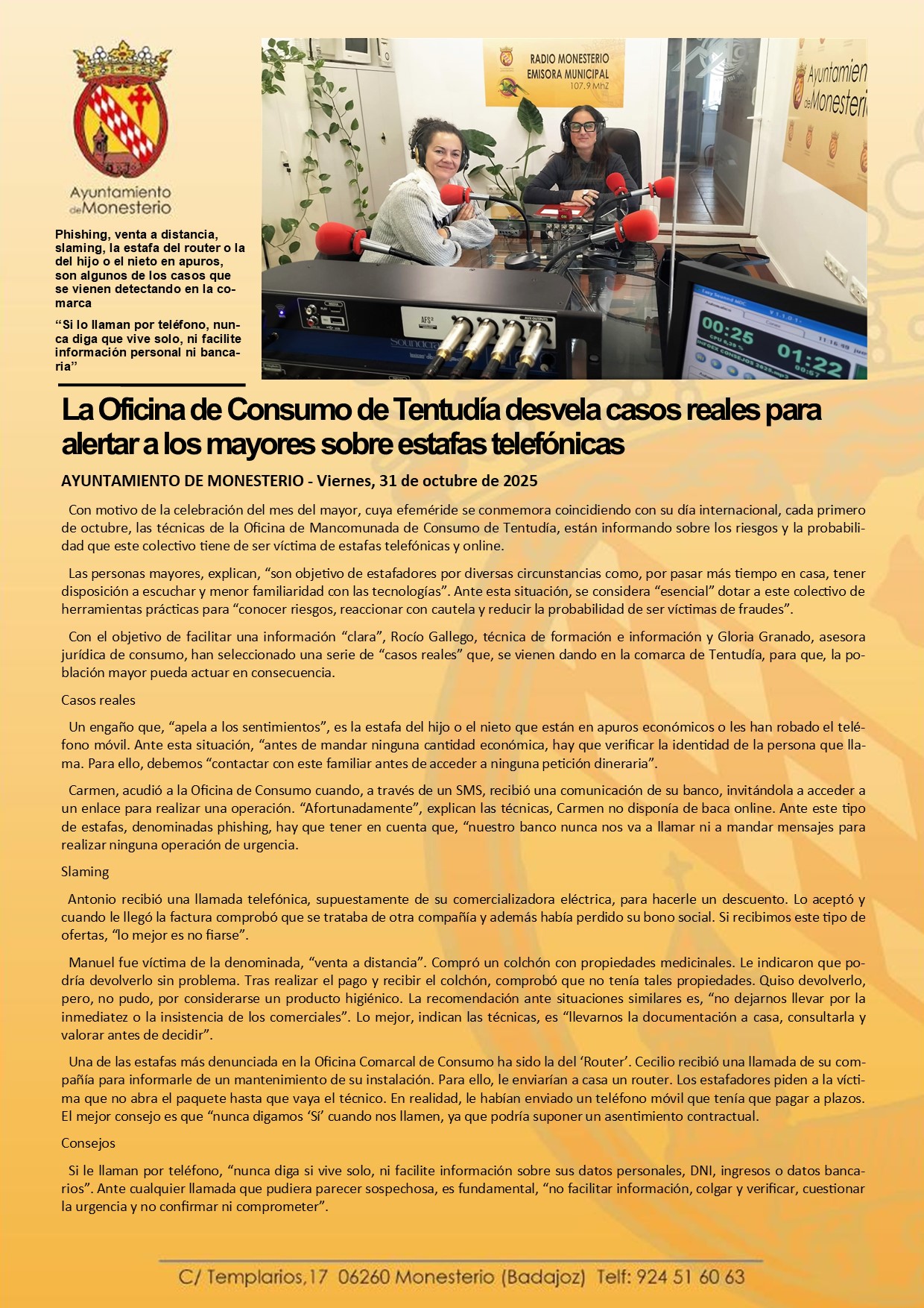 La Oficina de Consumo de Tentudía desvela casos reales para alertar a los mayores sobre estafas telefónicas