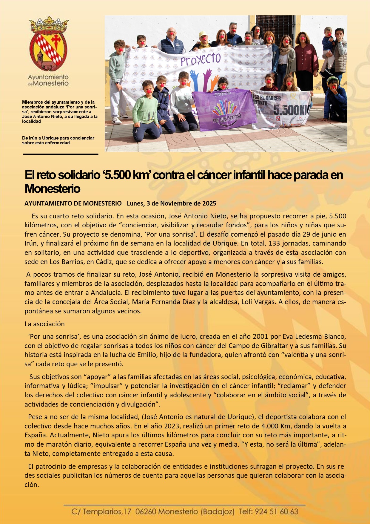 El reto solidario ‘5.500 km’ contra el cáncer infantil hace parada en Monesterio