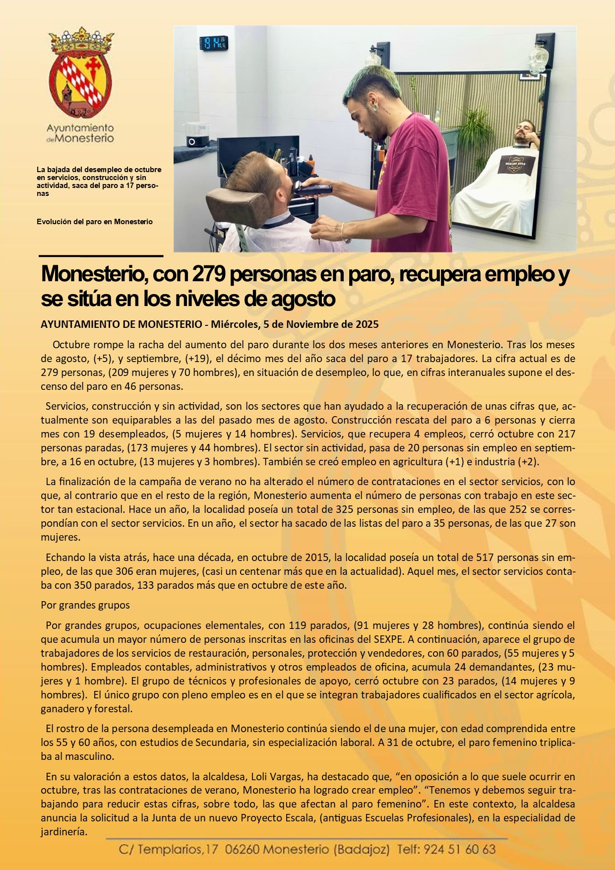 Monesterio, con 279 personas en paro, recupera empleo y se sitúa en los niveles de agosto