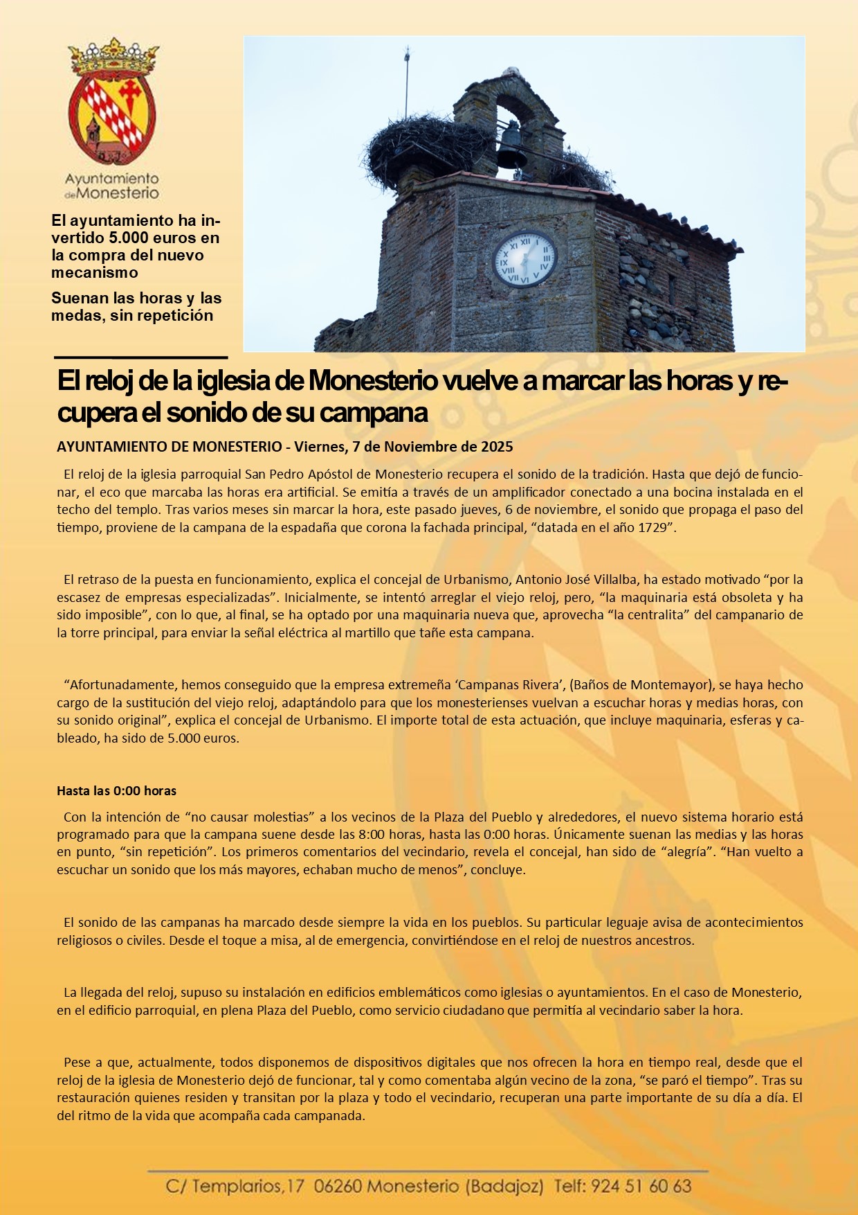 El reloj de la iglesia de Monesterio vuelve a marcar las horas y recupera el sonido de su campana
