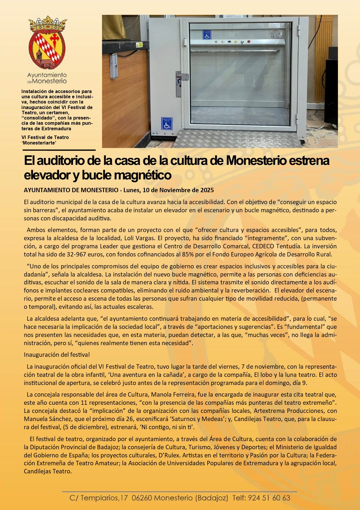 El auditorio de la casa de la cultura de Monesterio estrena elevador y bucle magnético