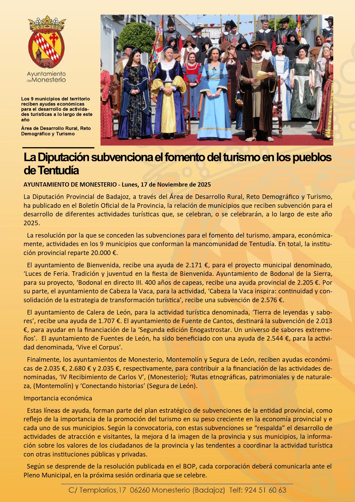 La Diputación subvenciona el fomento del turismo en los pueblos de Tentudía