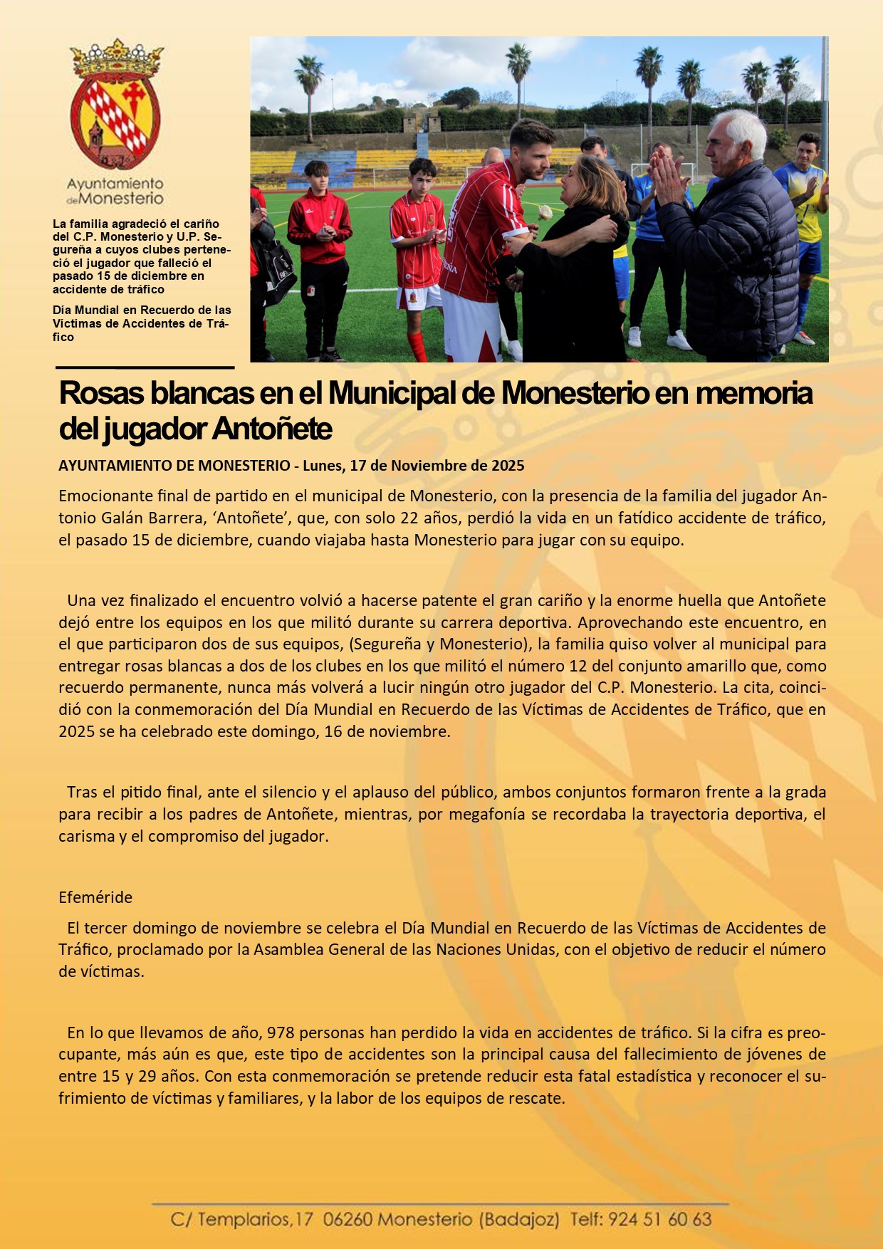 Rosas blancas en el Municipal de Monesterio en memoria del jugador Antoñete