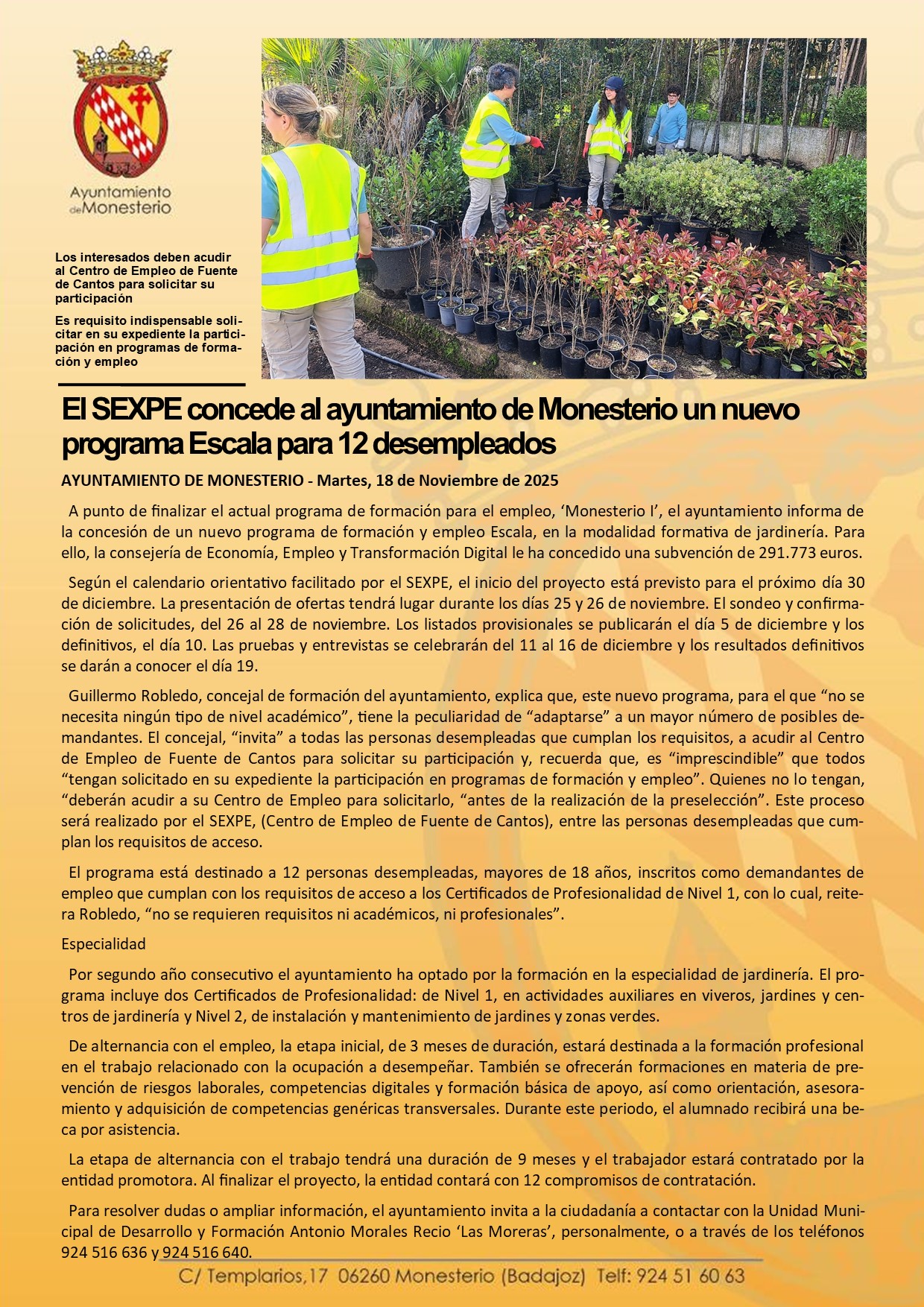 El SEXPE concede al ayuntamiento de Monesterio un nuevo programa Escala para 12 desempleados
