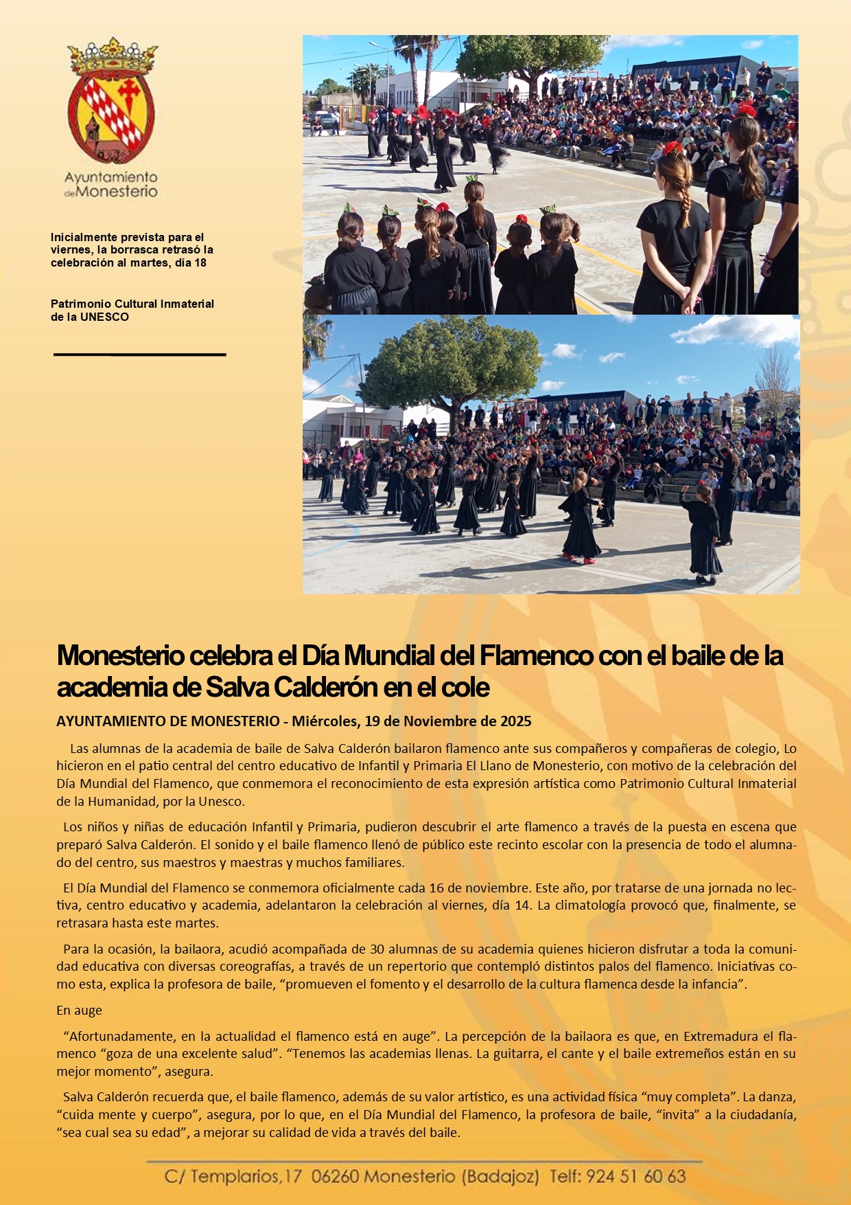 Monesterio celebra el Día Mundial del Flamenco con el baile de la academia de Salva Calderón en el cole