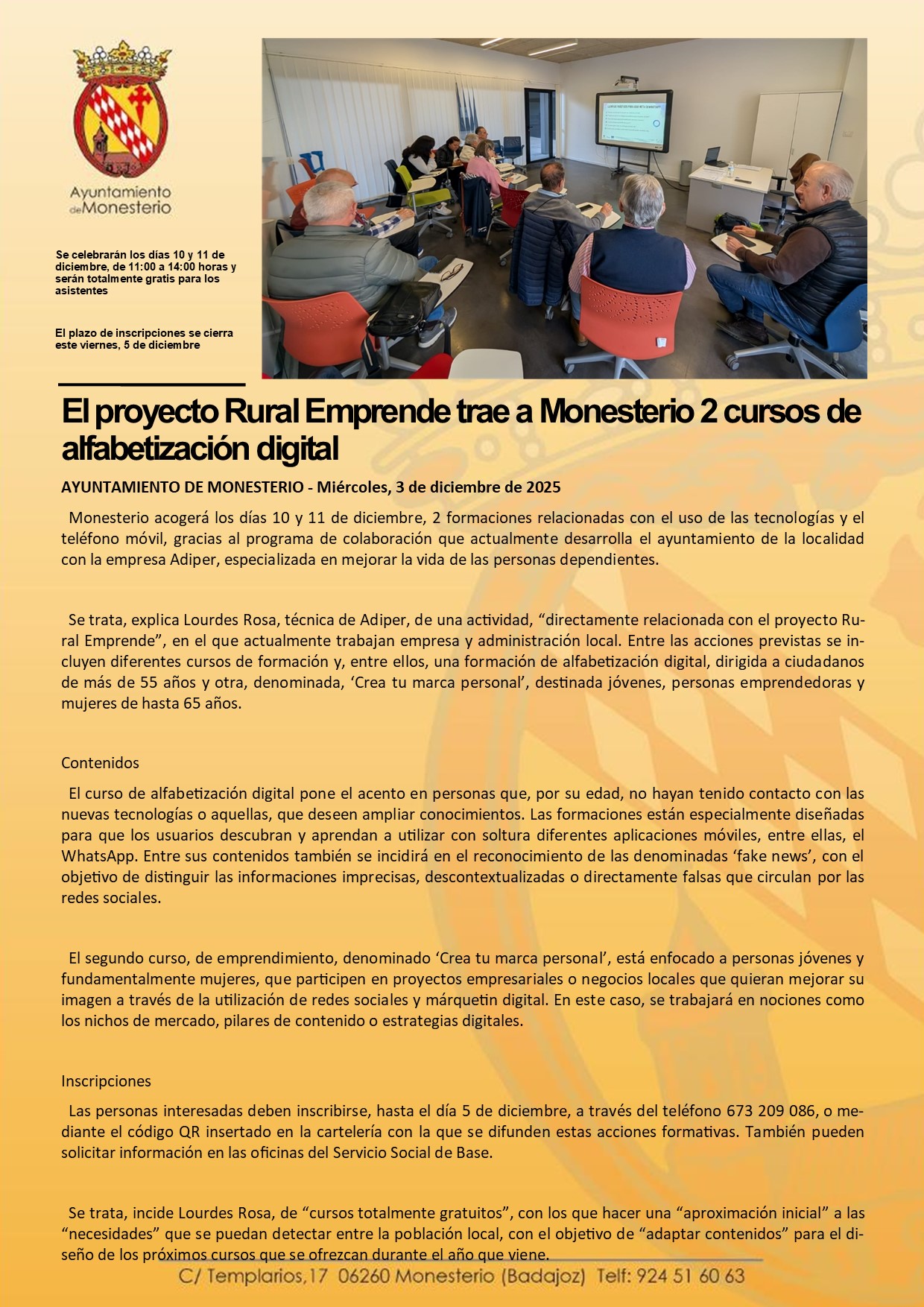 El proyecto Rural Emprende trae a Monesterio 2 cursos de alfabetización digital