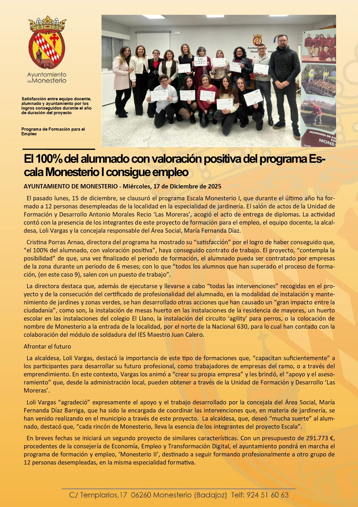 El 100% del alumnado con valoración positiva del programa Escala Monesterio I consigue empleo