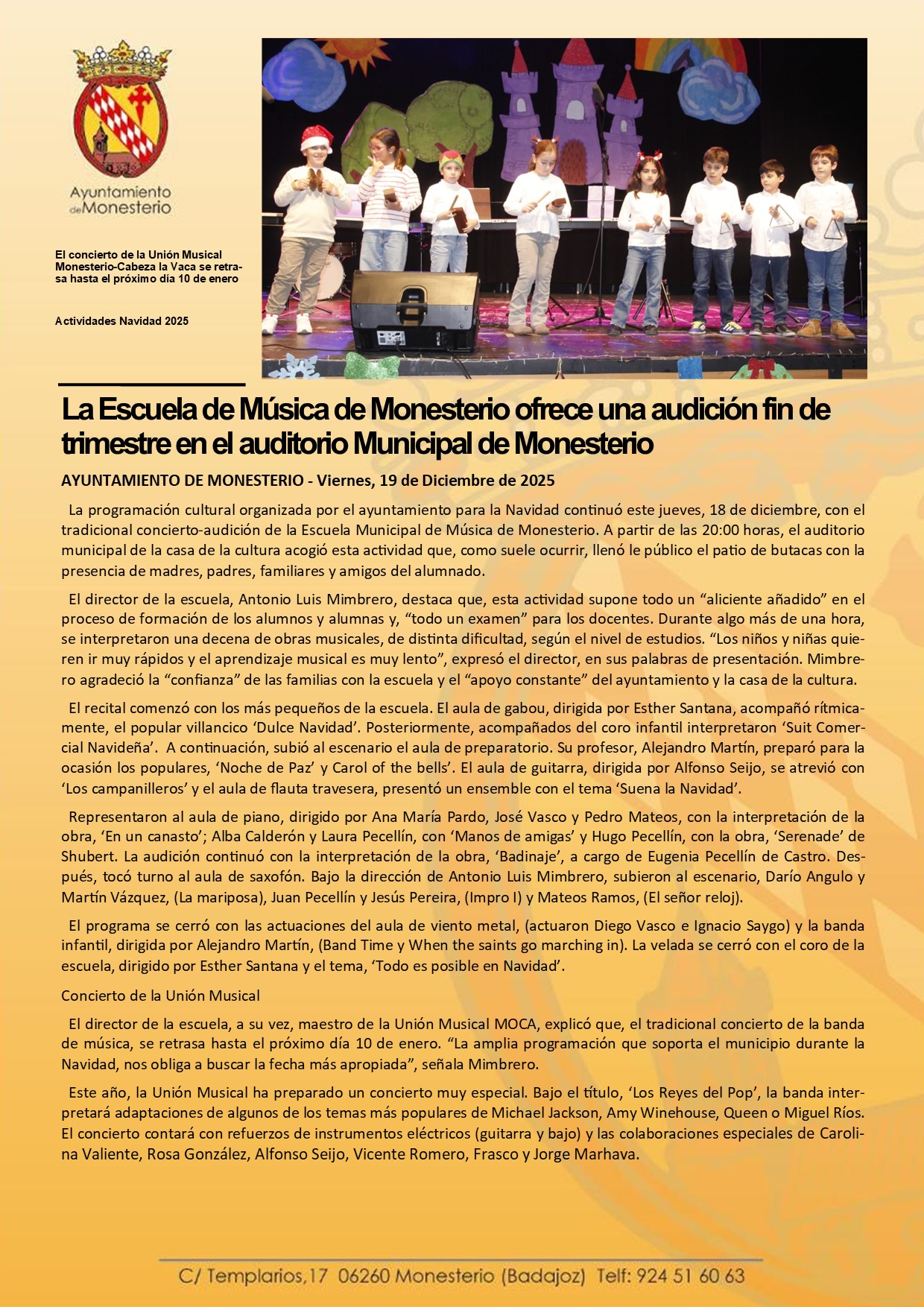 La Escuela de Música de Monesterio ofrece una audición fin de trimestre en el auditorio Municipal de Monesterio