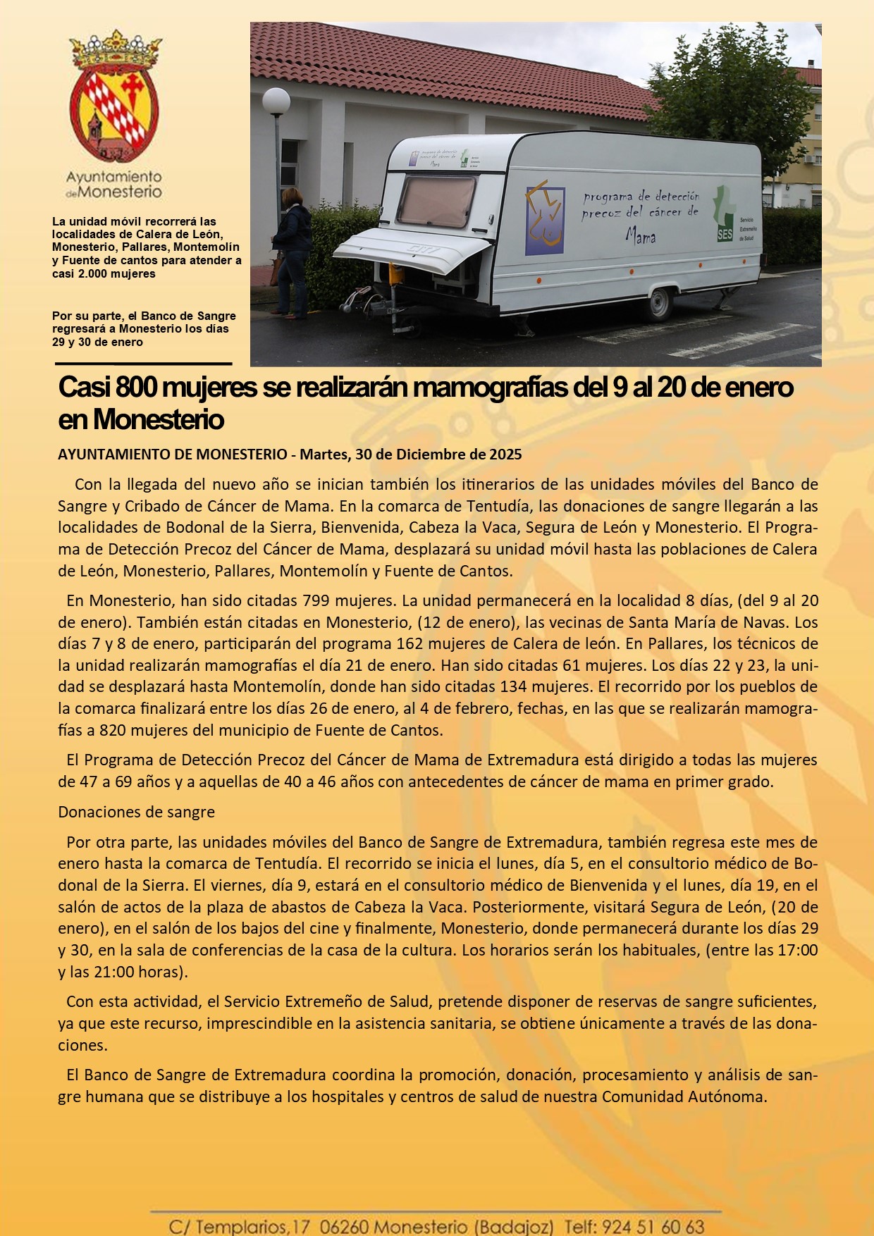 Casi 800 mujeres se realizarán mamografías del 9 al 20 de enero en Monesterio