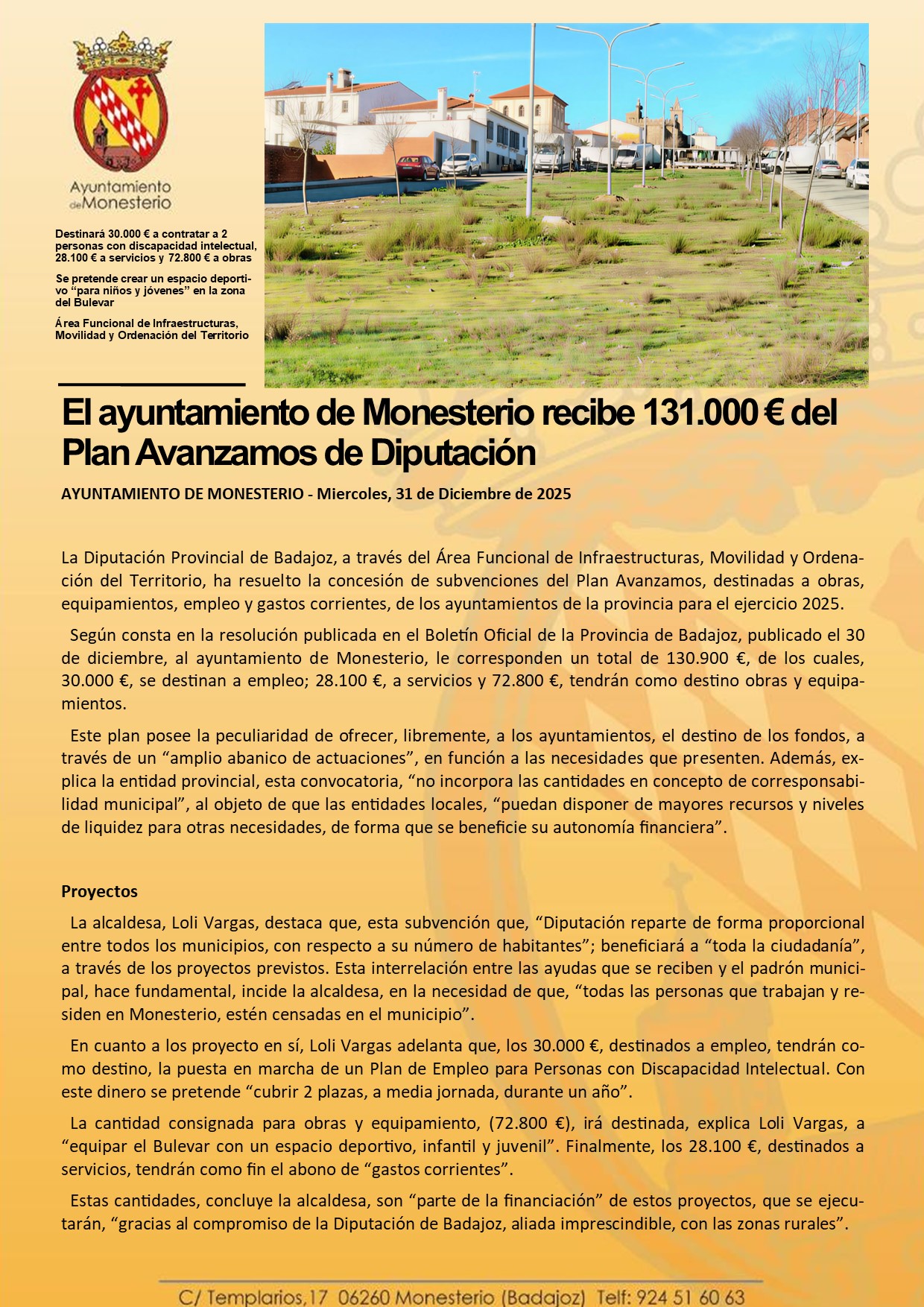 El ayuntamiento de Monesterio recibe 131.000 € del Plan Avanzamos de Diputación