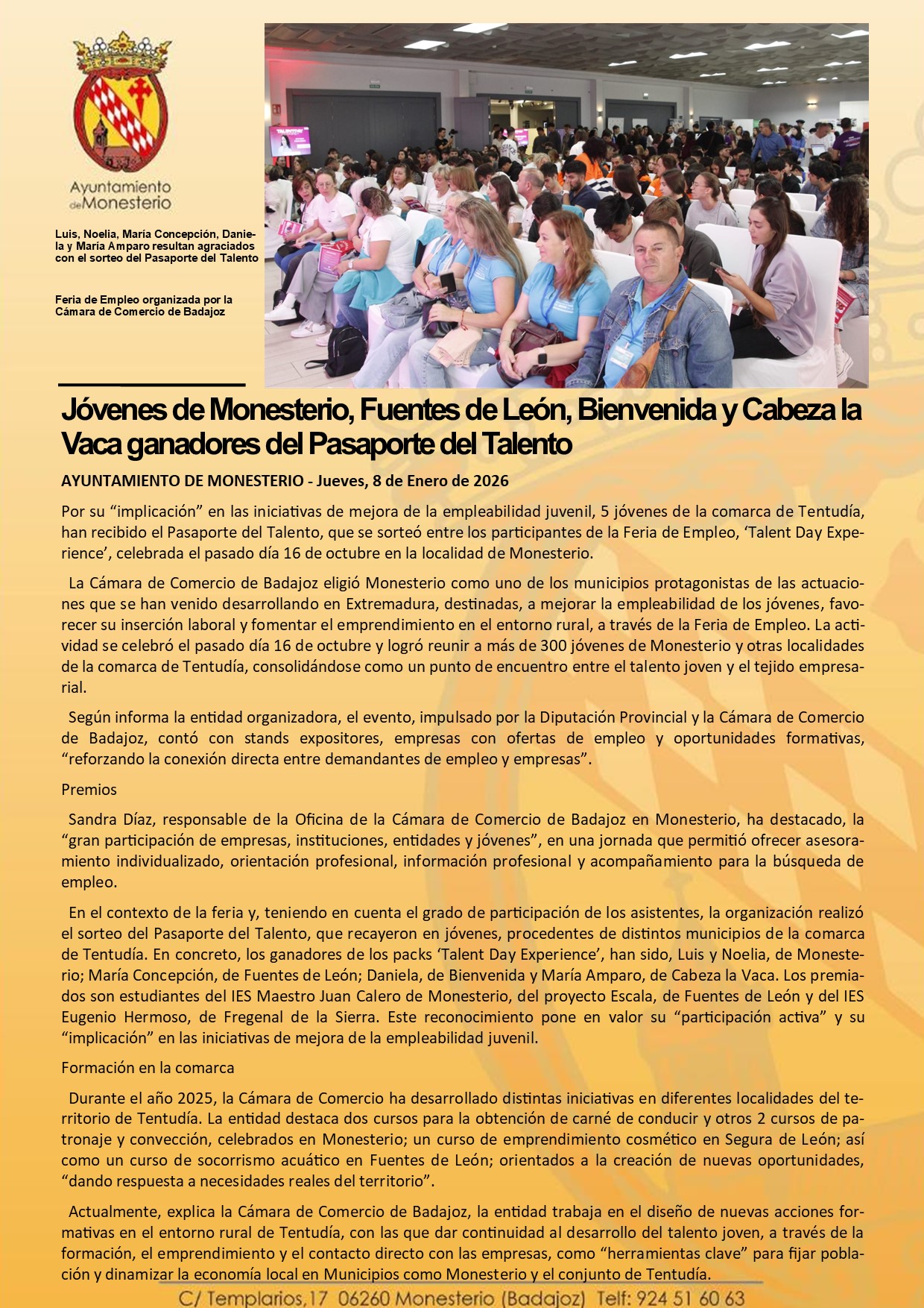 Jóvenes de Monesterio, Fuentes de León, Bienvenida y Cabeza la Vaca ganadores del Pasaporte del Talento