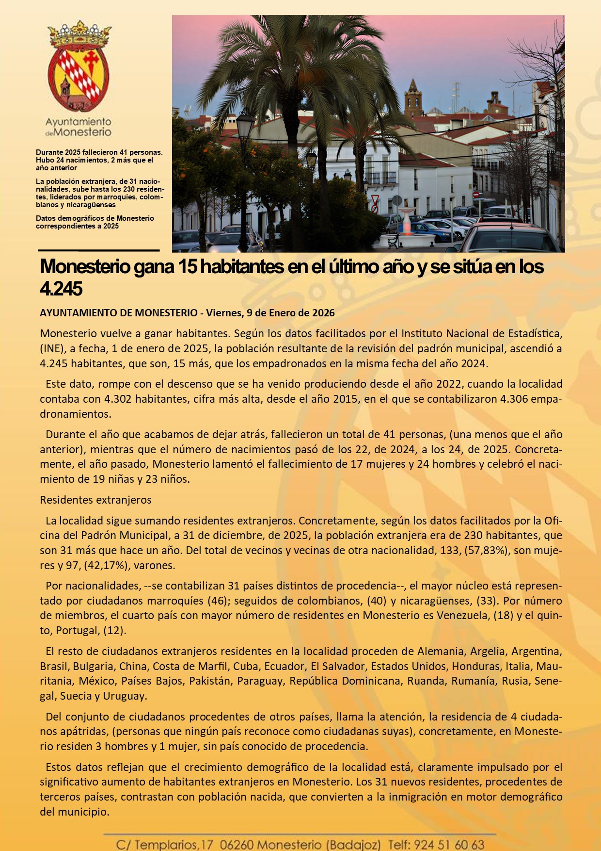 Monesterio gana 15 habitantes en el último año y se sitúa en los 4.245