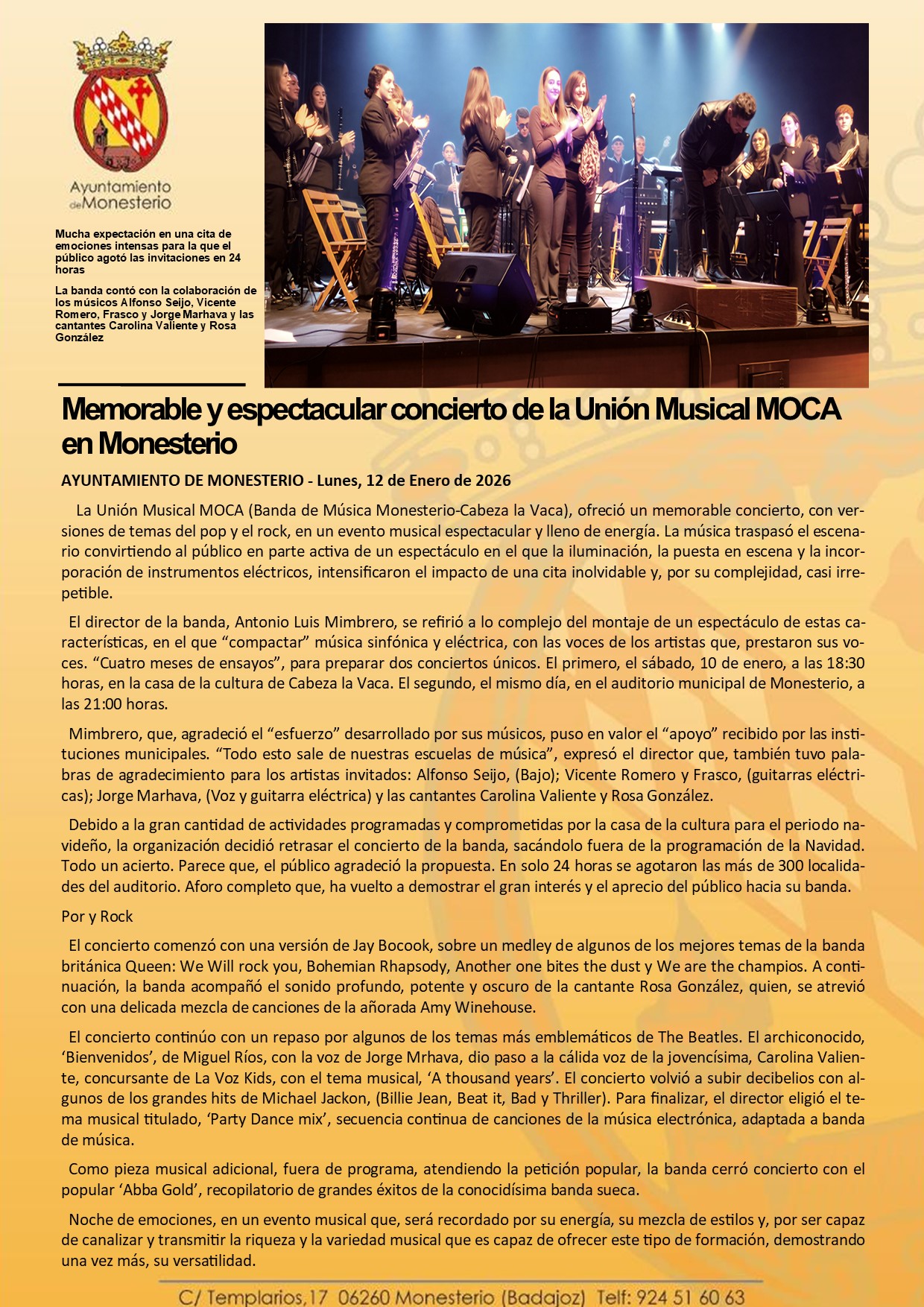 Memorable y espectacular concierto de la Unión Musical MOCA en Monesterio