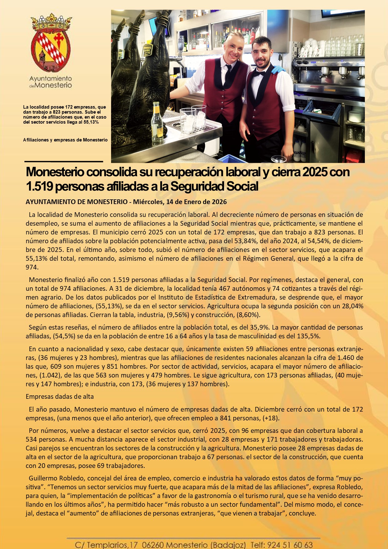 Monesterio consolida su recuperación laboral y cierra 2025 con 1.519 personas afiliadas a la Seguridad Social