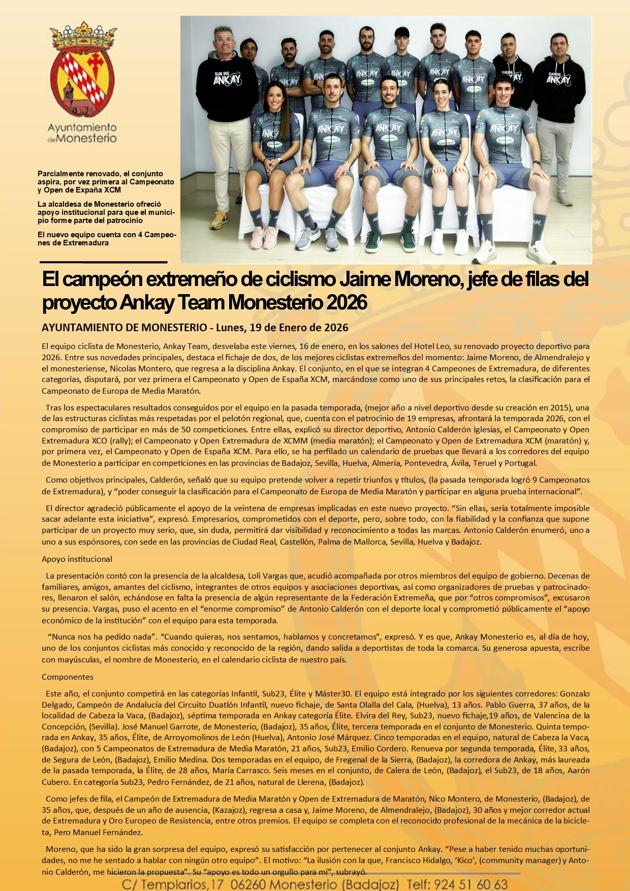 El campeón extremeño de ciclismo Jaime Moreno jefe de filas del proyecto Ankay Team Monesterio 2026