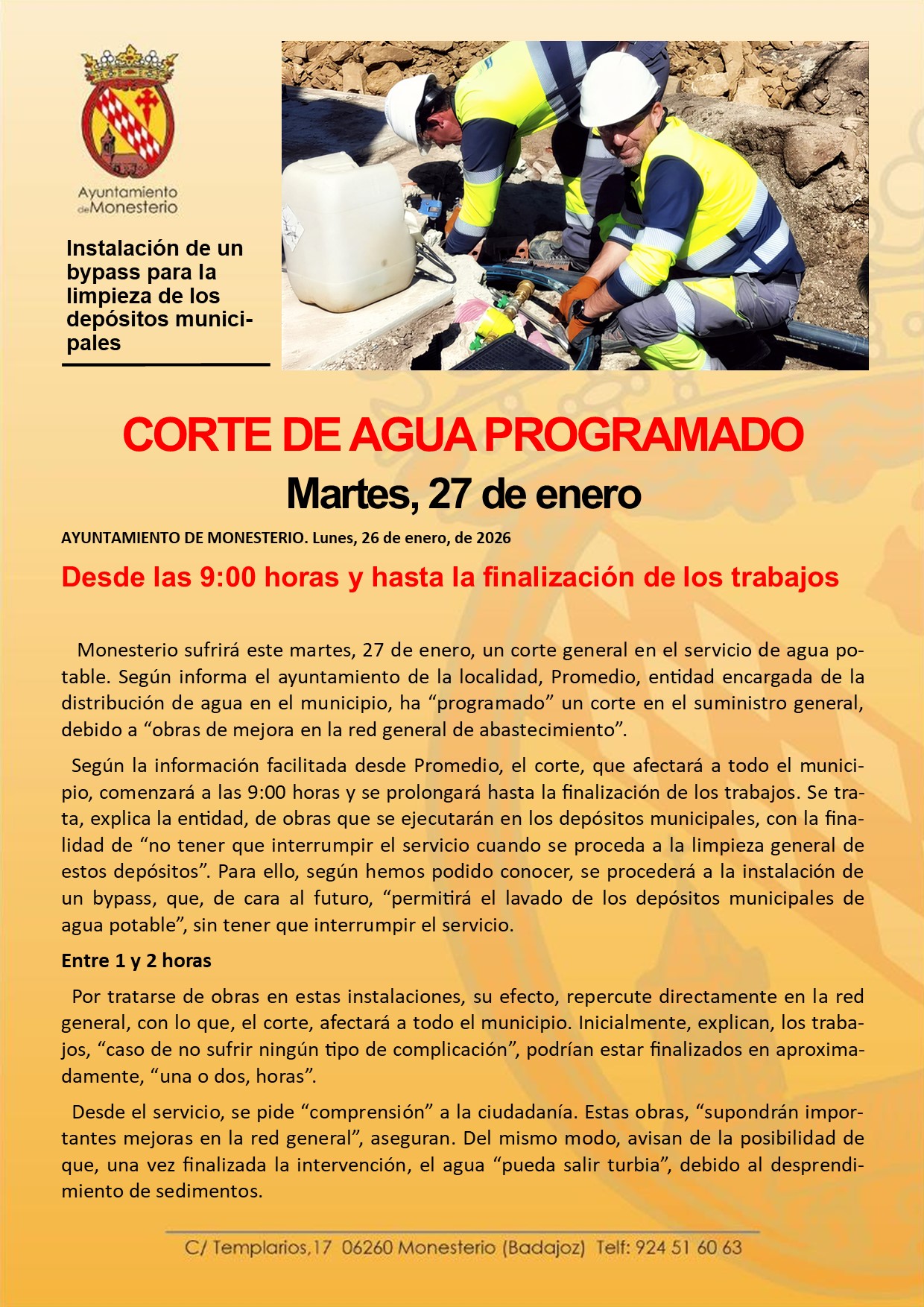 Corte de agua programado este martes