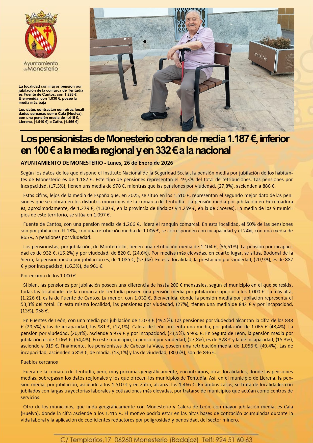 Los pensionistas de Monesterio cobran de media 1.187 €, inferior en 100 € a la media regional y en 332 € a la nacional