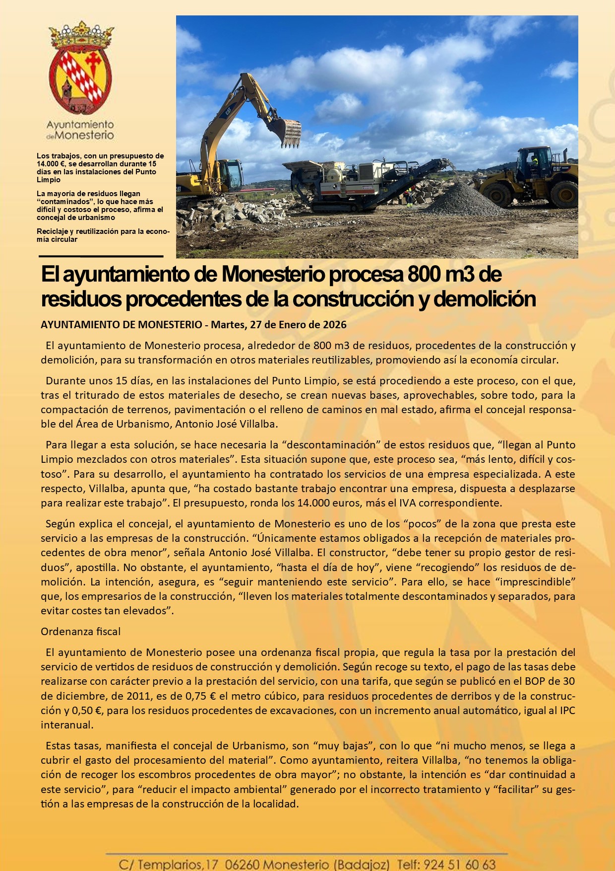 El ayuntamiento de Monesterio procesa 800 m3 de residuos procedentes de la construcción y demolición
