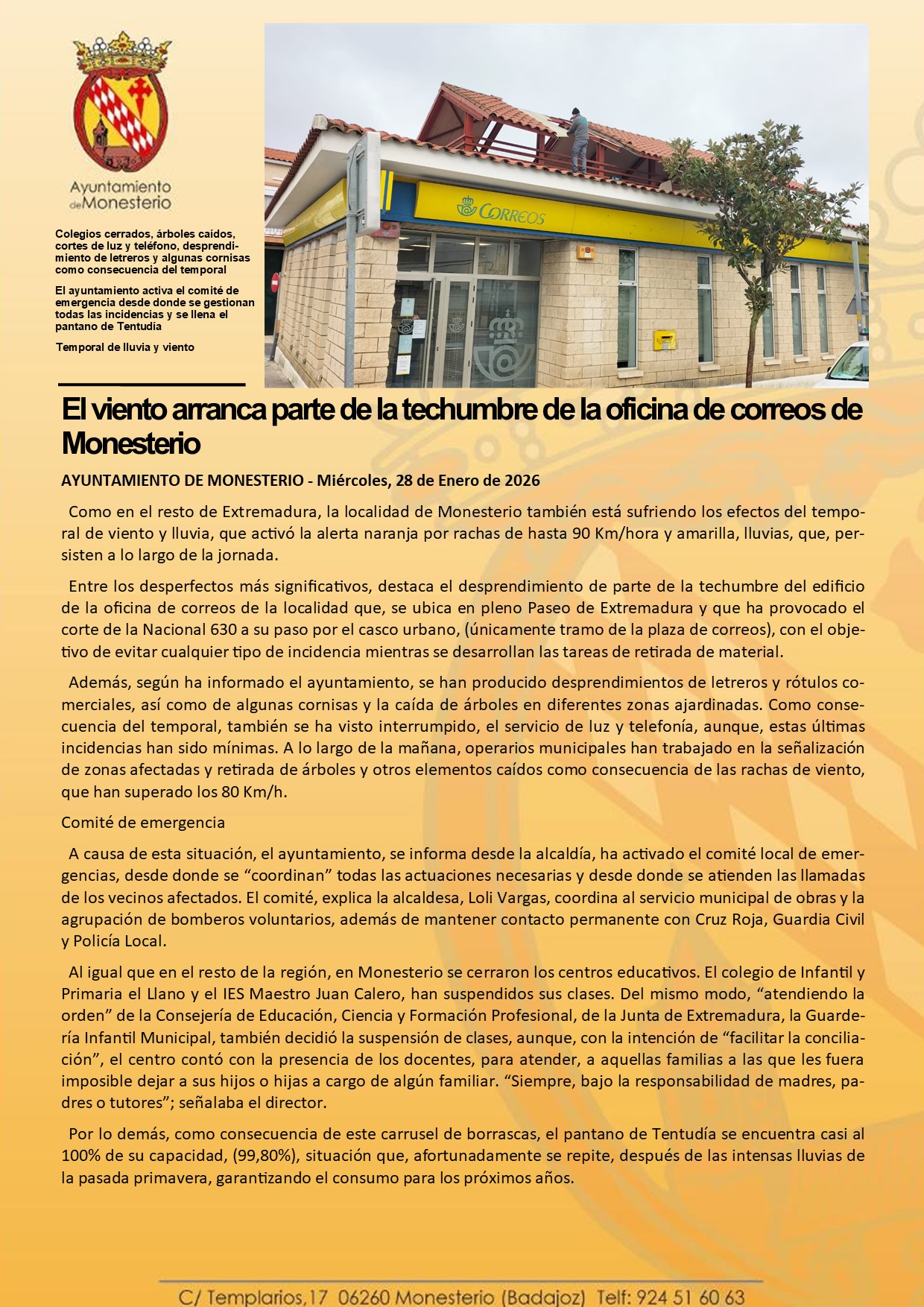 El viento arranca parte de la techumbre de la oficina de correos de Monesterio