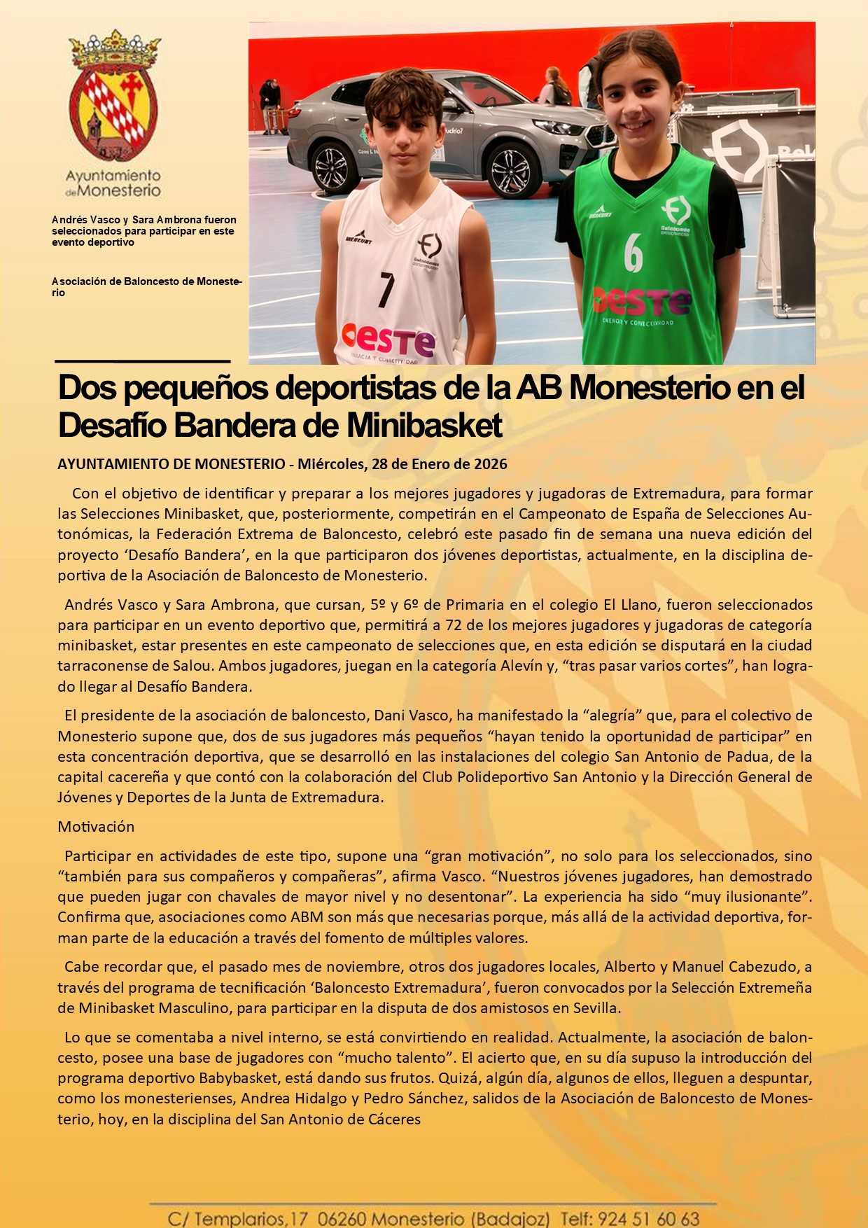 Dos pequeños deportistas de la AB Monesterio en el Desafío Bandera de Minibasket