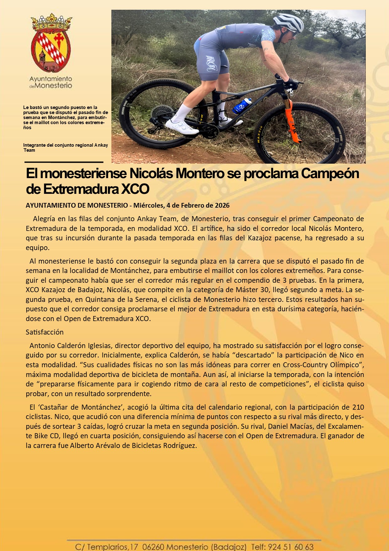 El monesteriense Nicolás Montero se proclama Campeón de Extremadura XCO
