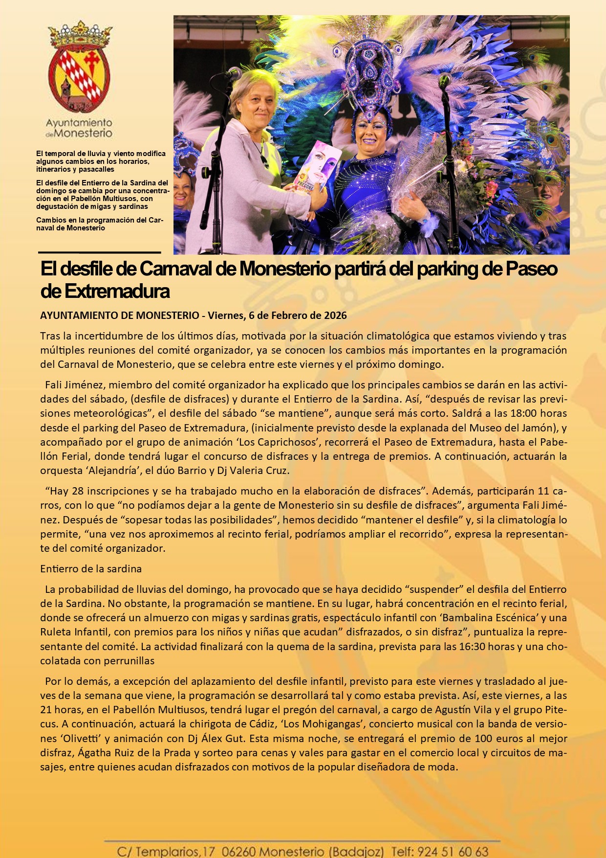 El desfile de Carnaval de Monesterio partirá del parking de Paseo de Extremadura
