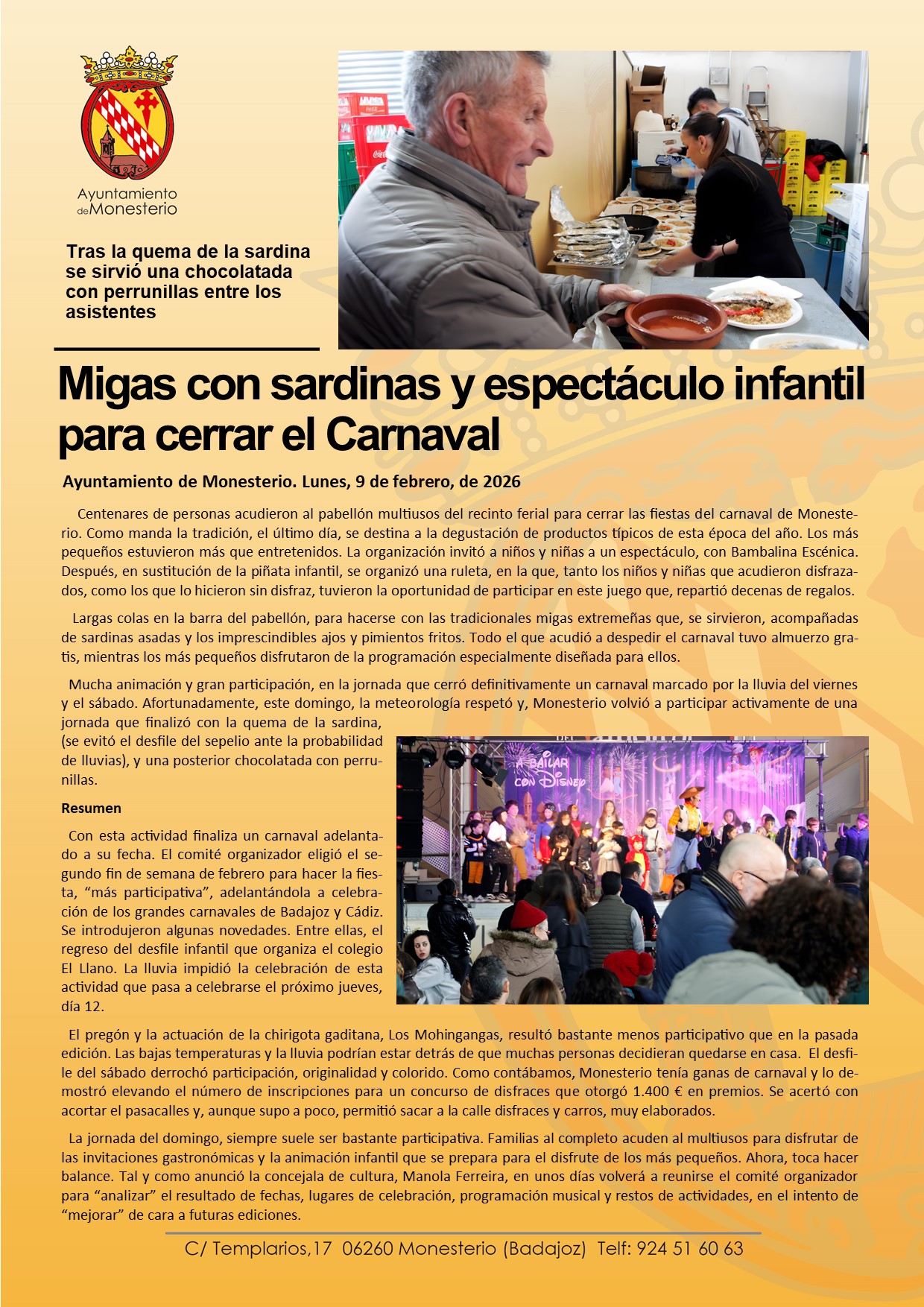 MIgas con sardina y espectáculo infantil para cerrar el Carnaval