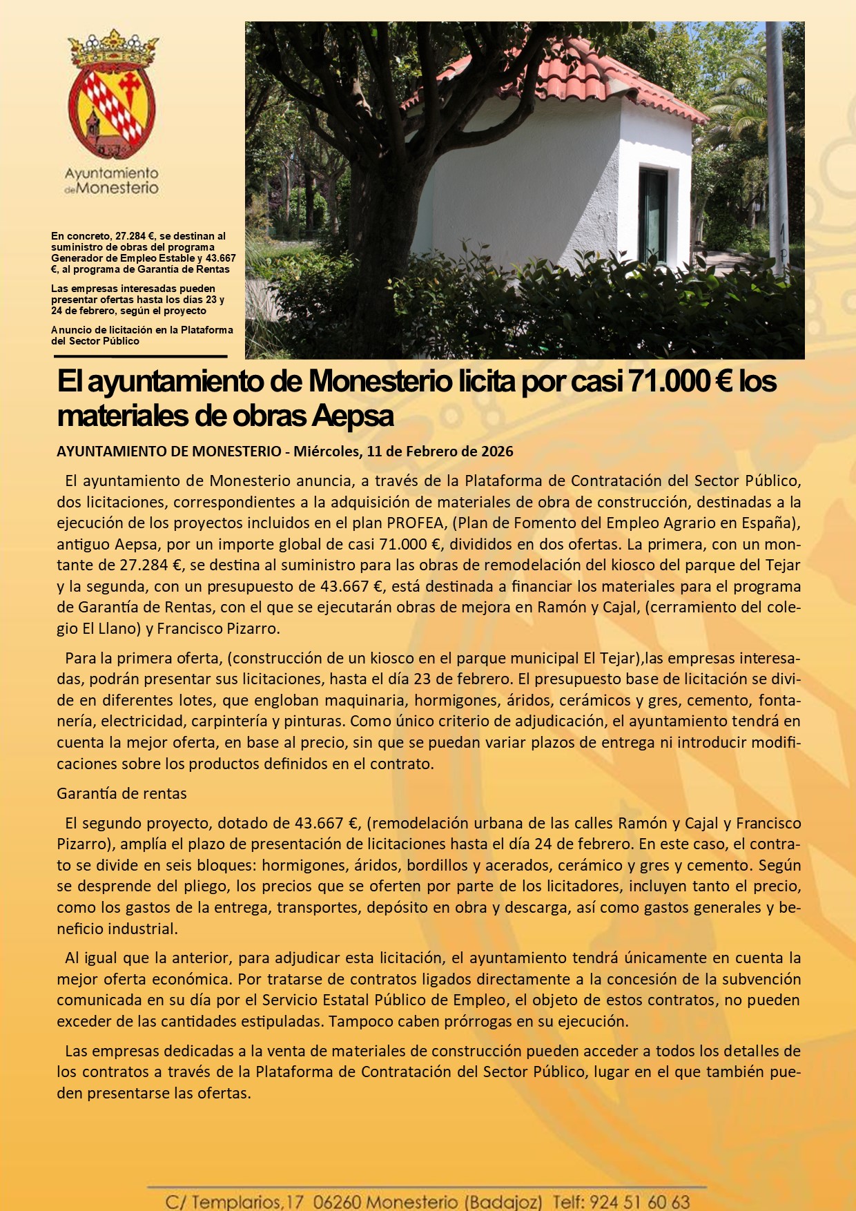 El ayuntamiento de Monesterio licita por casi 71.000 € los materiales de obras Aepsa