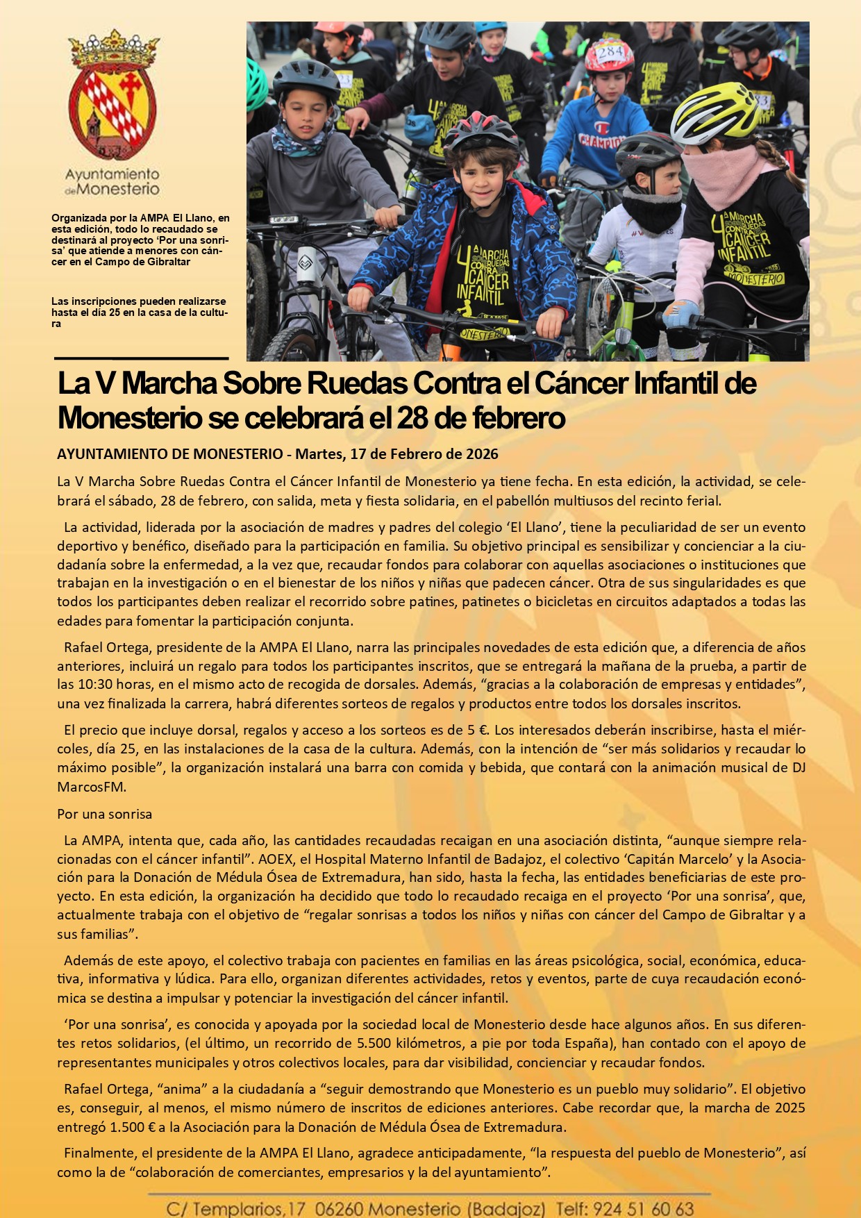 La V Marcha Sobre Ruedas Contra el Cáncer Infantil de Monesterio se celebrará el 28 de febrero