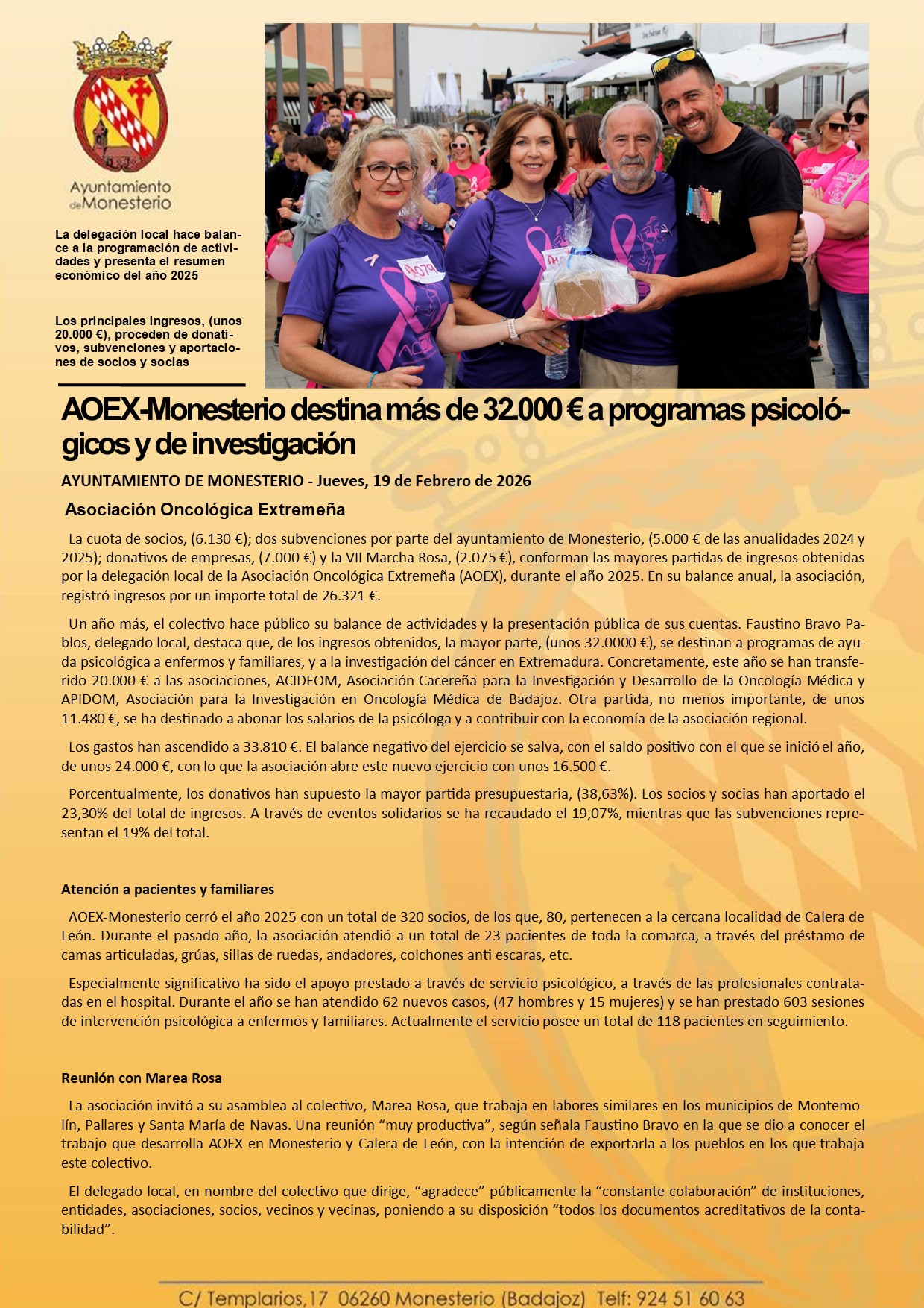 AOEX-Monesterio destina más de 32.000 € a programas psicológicos y de investigación