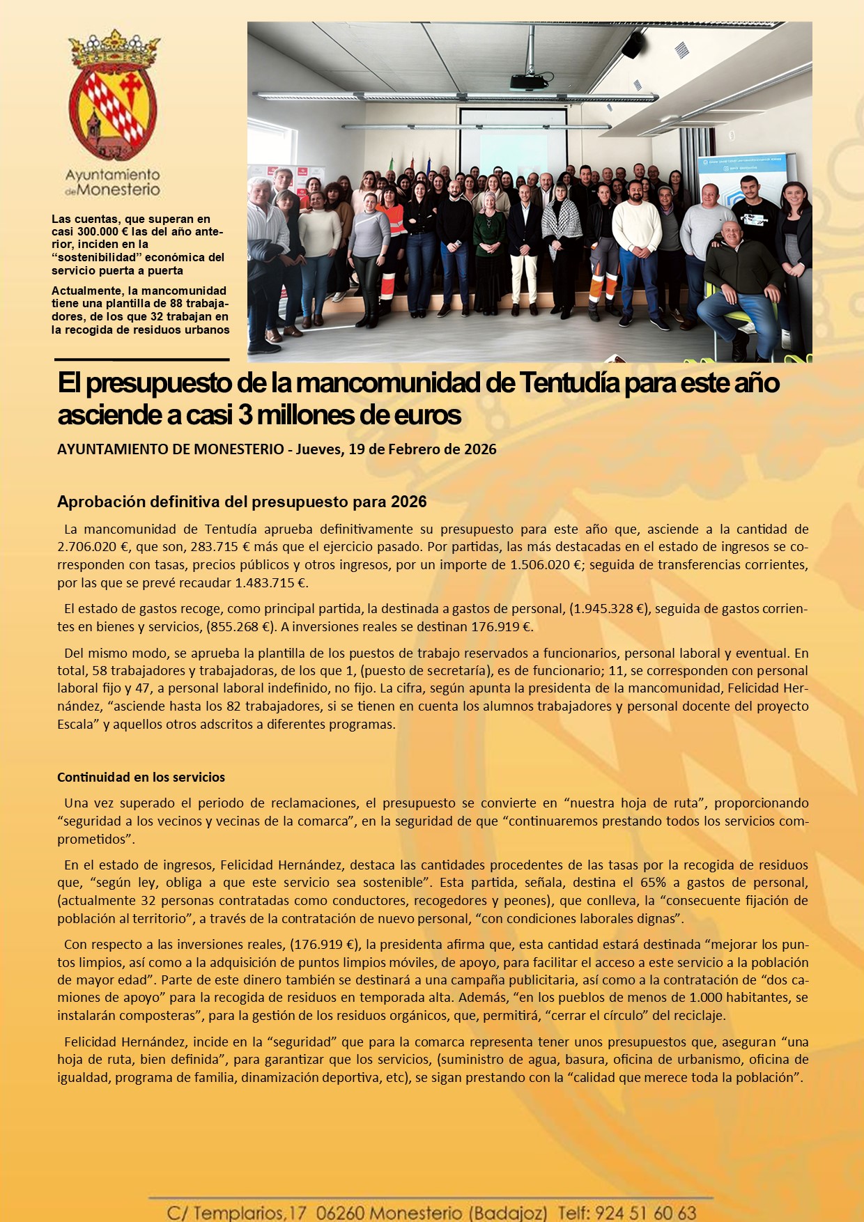 El presupuesto de la mancomunidad de Tentudía para este año asciende a casi 3 millones de euros