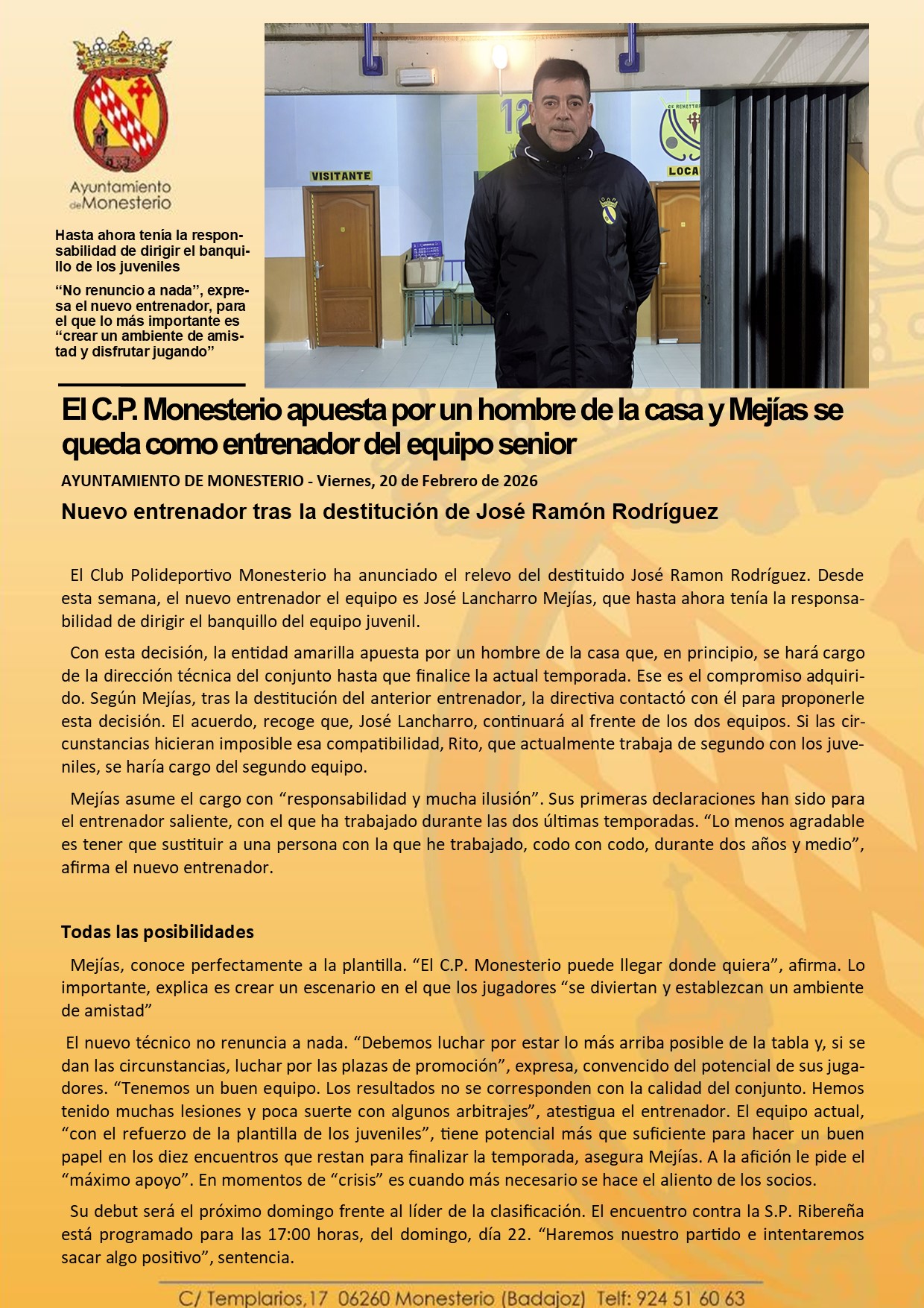El C.P. Monesterio apuesta por un hombre de la casa y Mejías se queda como entrenador del equipo senior