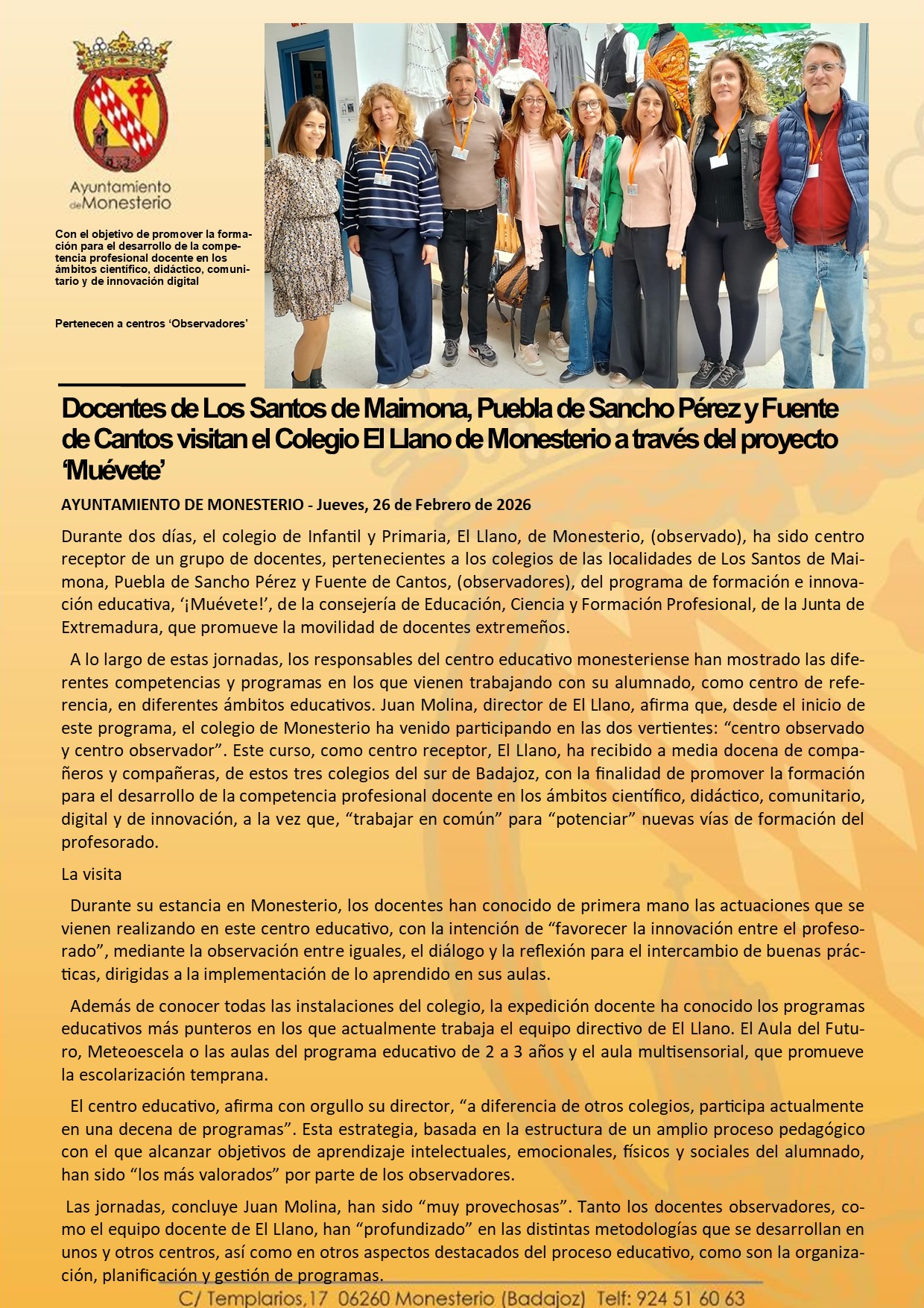 Docentes de Los Santos de Maimona, Puebla de Sancho Pérez y Fuente de Cantos visitan el Colegio El Llano de Monesterio a través del proyecto ‘Muévete’